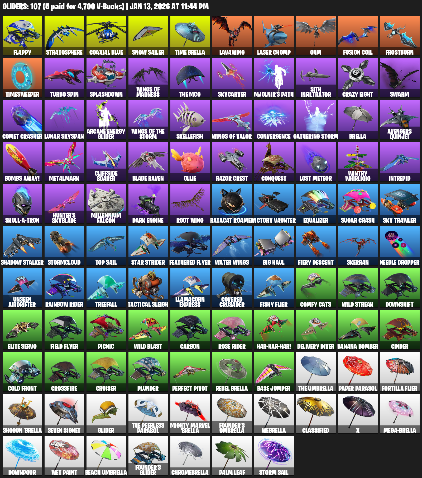 Flappy, Stratosphere, Coaxial Blue, Snow Sailer, Time Brella, Lavawing, Laser Chomp, Ohm, Frostburn, Timesweeper, Turbo Spin, Splashdown, Skycarver, Mjolnir’s Path, Sith Infiltrator, Crazy Eight, Swarm