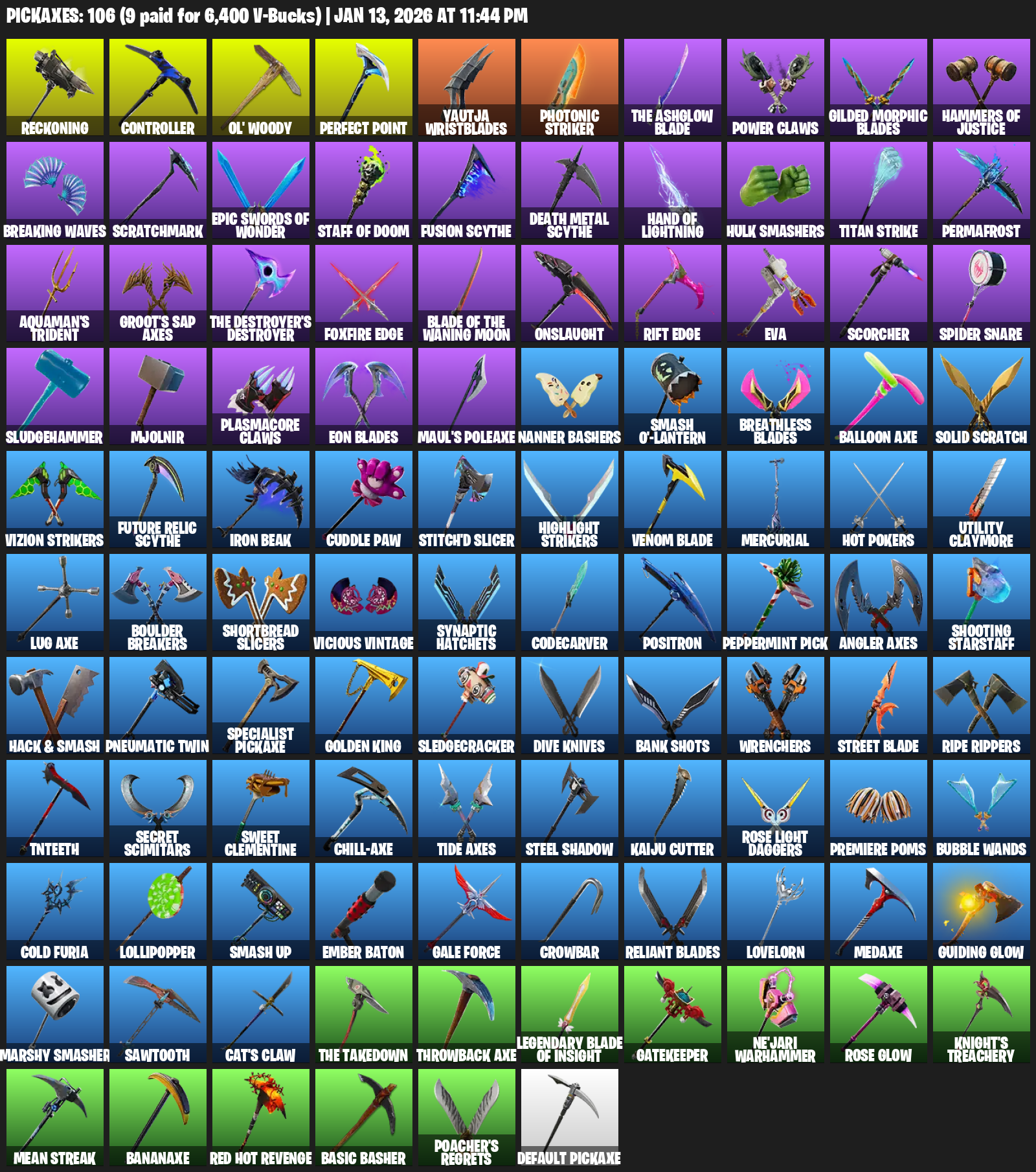 Reckoning, Controller, Ol’ Woody, Yautja Wristblades, Photonic Striker, Power Claws, Gilded Morphic Blades, Hammers of Justice, Breaking Waves, Scratchmark, Fusion Scythe, Hulk Smashers, Titan Strike, Permafrost