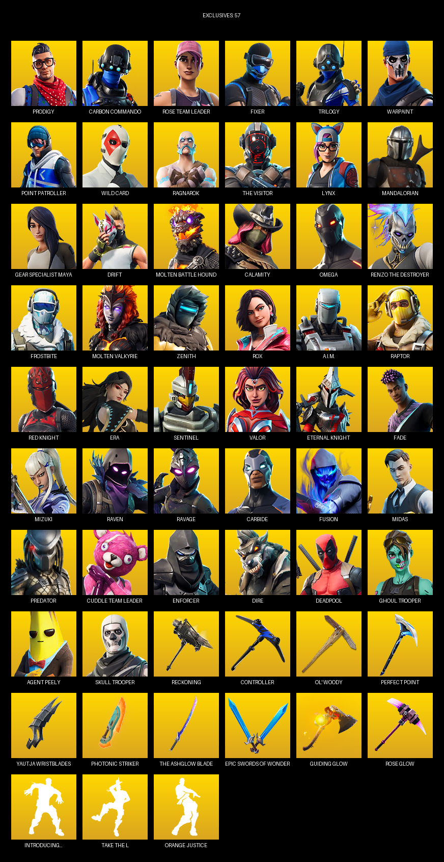 Point Patroller, Gear Specialist Maya, Omega, Prodigy, Carbon Commando, Rose Team Leader, Fixer, Trilogy, Warpaint, Wild Card, Ragnarok, The Visitor, Lynx, Mandalorian, Drift, Molten Battle Hound, Calamity, Frostbite