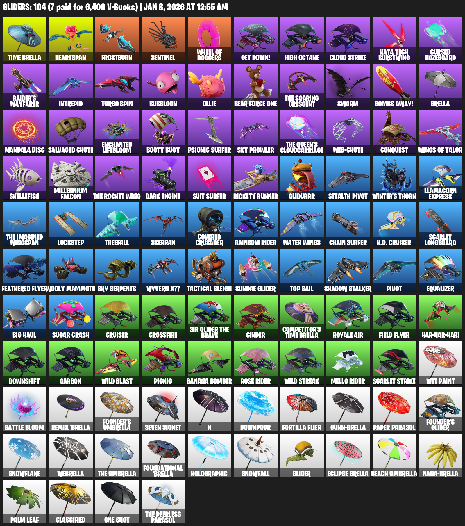 Time Brella, Heartspan, Frostburn, Sentinel, Wheel of Daggers, Get Down!, High Octane, Cloud Strike, Kata Tech Burstwing, Cursed Hazeboard, Raider’s Wayfarer, Intrepid, Turbo Spin, Bubbloon, Ollie, Bear Force One, Swarm, Bombs Away!