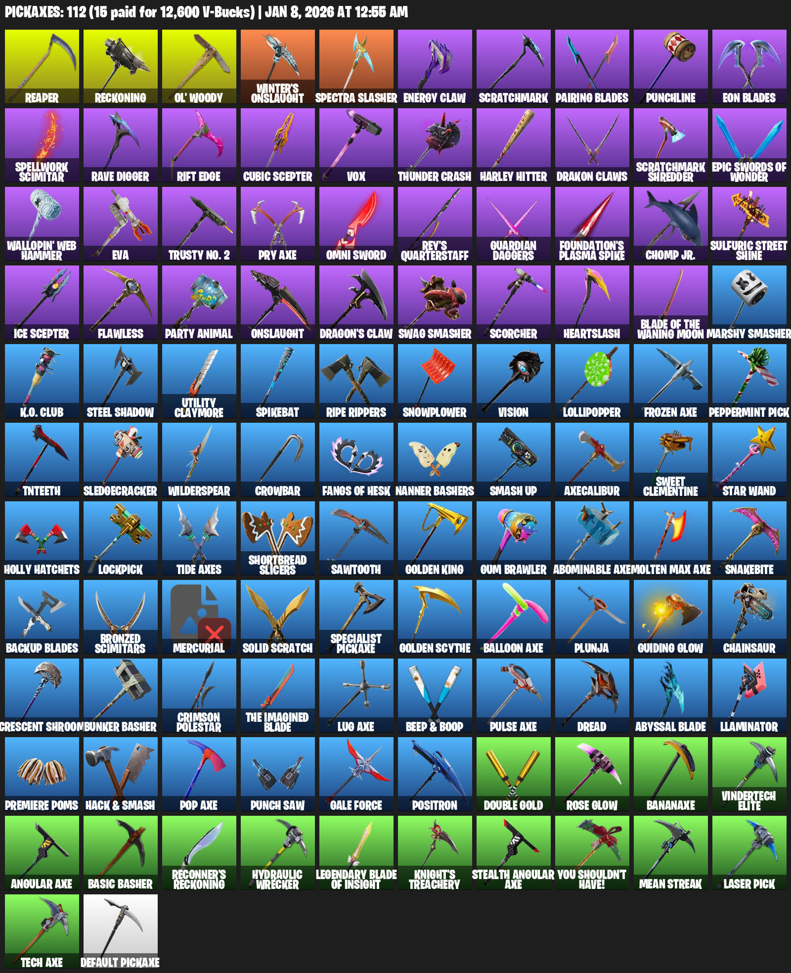 Reckoning, Ol’ Woody, Winter’s Onslaught, Spectra Slasher, Energy Claw, Scratchmark, Pairing Blades, Punchline, Spellwork Scimitar, Rave Digger, Rift Edge, Cubic Scepter, Vox, Thunder Crash, Harley Hitter, Drakon Claws