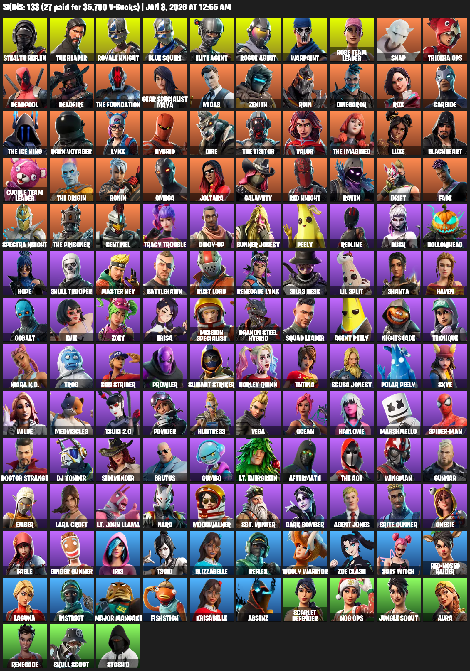 The Reaper, Royale Knight, Blue Squire, Elite Agent, Gear Specialist Maya, Omega, Lara Croft, Stealth Reflex, Warpaint, Rose Team Leader, Snap, Tricera Ops, Deadpool, Deadfire, Midas, Zenith, Ruin, Omegarok