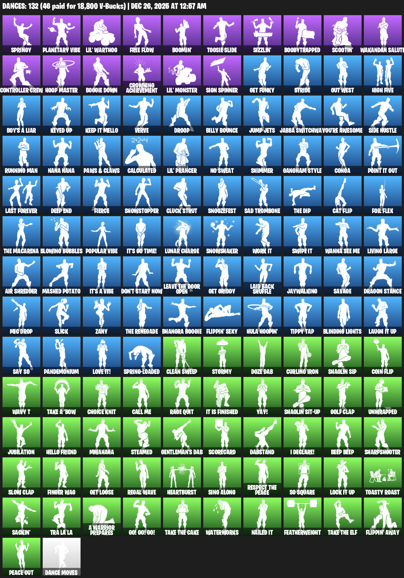 Springy, Planetary Vibe, Lil’ Warthog, Free Flow, Boomin’, Toosie Slide, Sizzlin’, Boobytrapped, Scootin’, Wakandan Salute, Controller Crew, Hoop Master, Boogie Down, Crowning Achievement, Sign Spinner, Get Funky, Stride, Out West, High Five