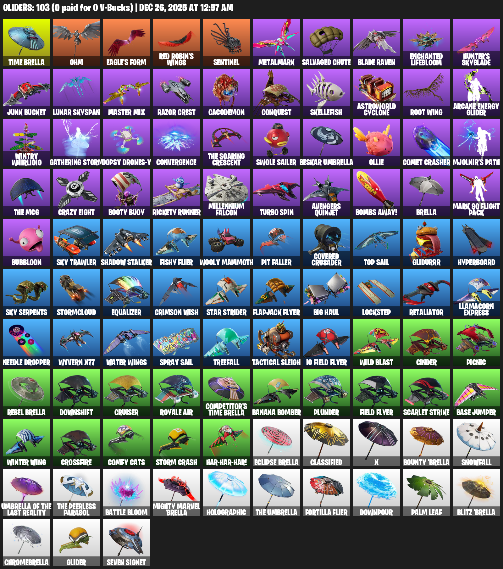 Time Brella, Ohm, Eagle’s Form, Red Robin’s Wings, Metalmark, Salvaged Chute, Enchanted Lifebloom, Hunter’s Skyblade, Junk Bucket, Lunar Skyspan, Razor Crest, Cacodemon, Conquest, Skellefish, Astroworld Cyclone, Root Wing