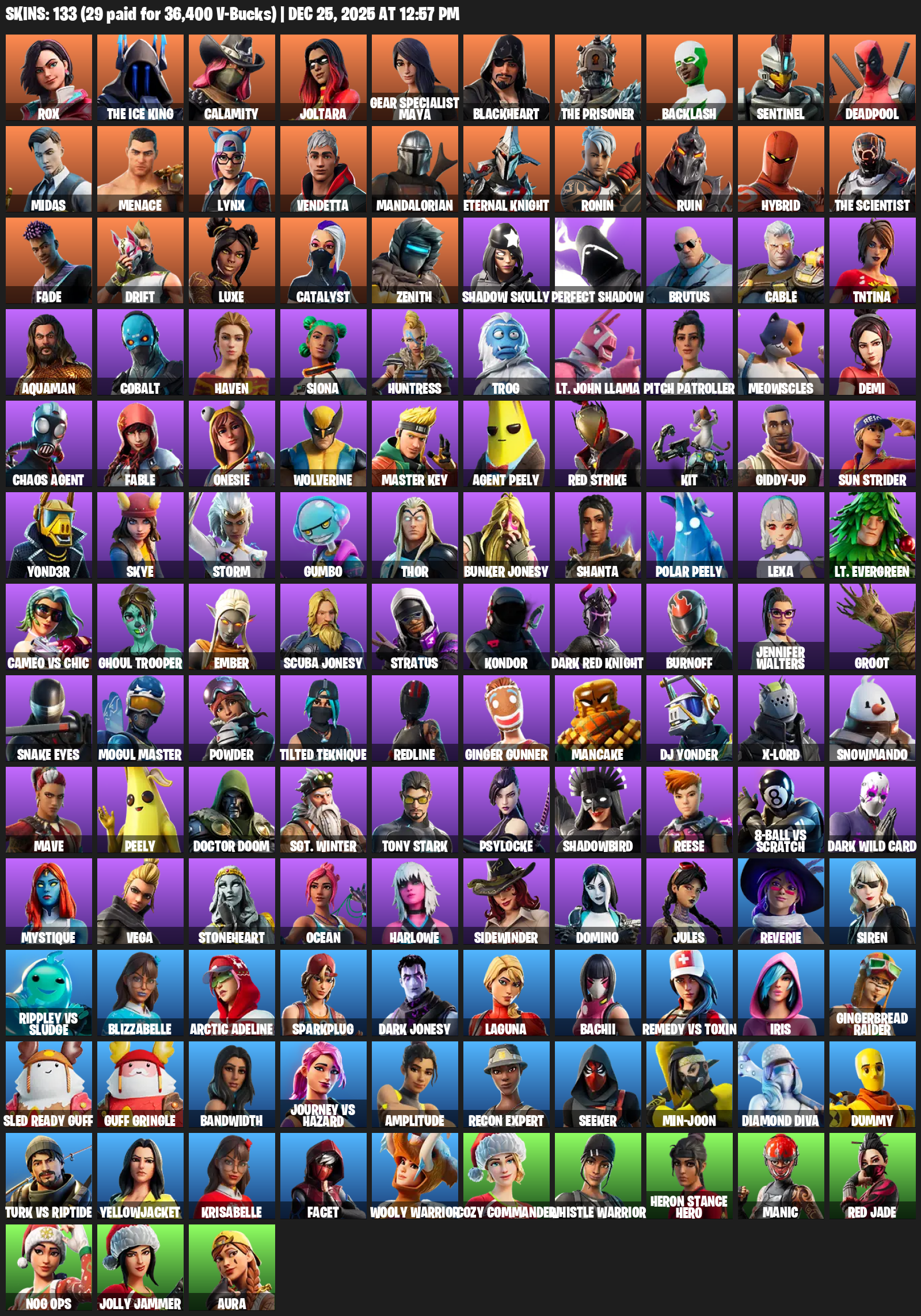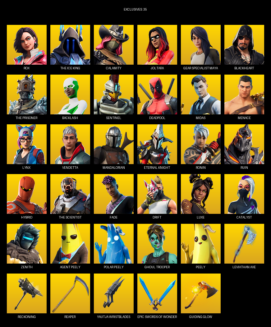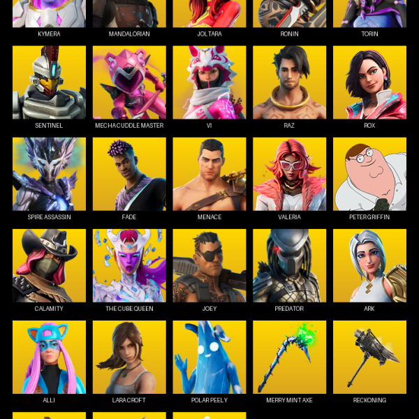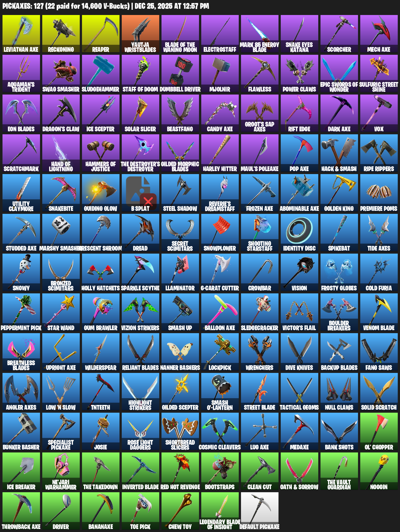 Leviathan Axe, Reckoning, Reaper, Yautja Wristblades, Electrostaff, Mark 85 Energy Blade, Snake Eyes Katana, Scorcher, Aquaman’s Trident, Swag Smasher, Sludgehammer, Staff of Doom, Dumbbell Driver, Mjolnir, Flawless, Power Claws, Sulfuric Street Shine