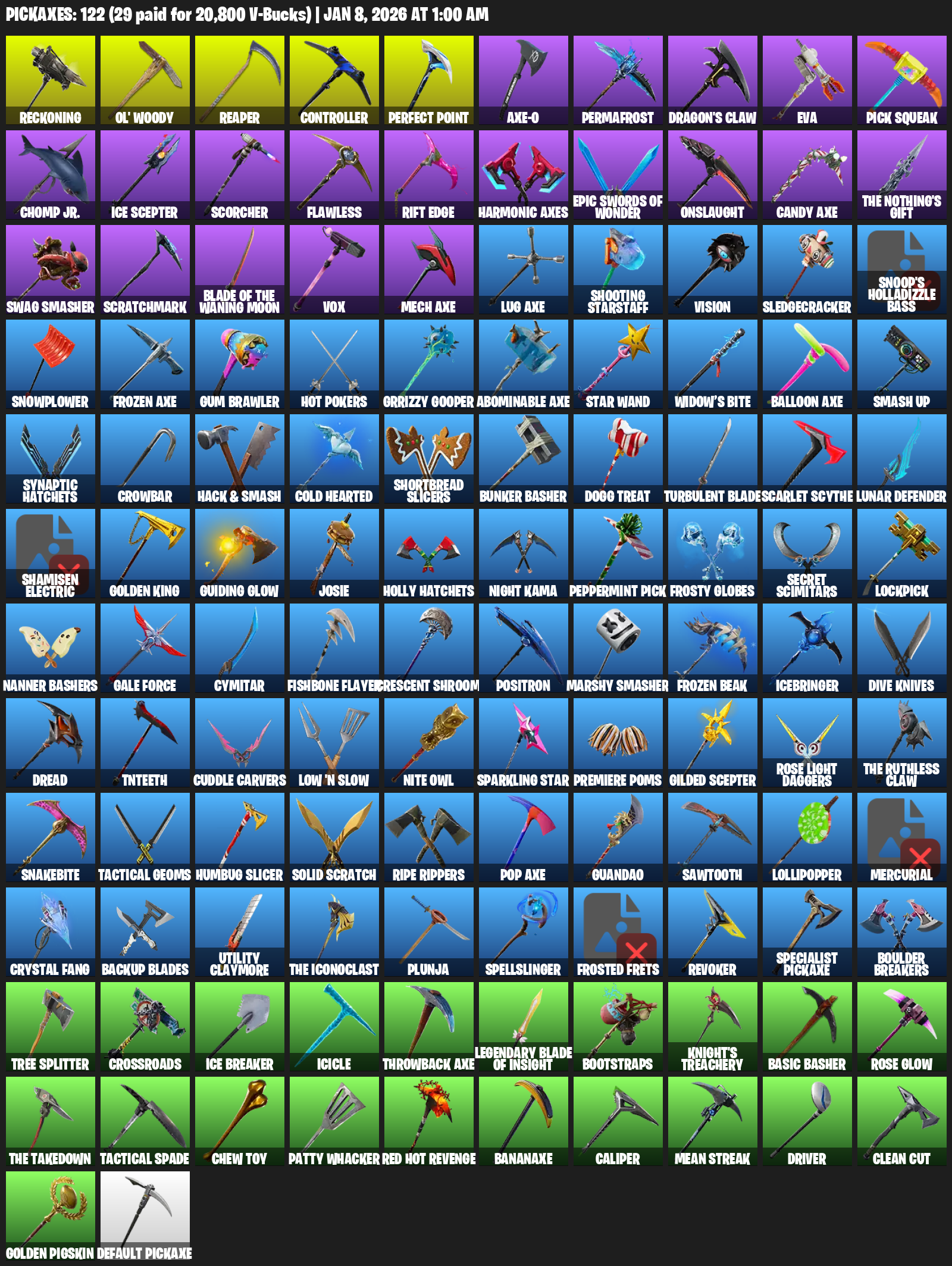 Reckoning, Ol’ Woody, Reaper, Controller, aXe-O, Permafrost, Dragon’s Claw, EVA, Pick Squeak, Chomp Jr., Ice Scepter, Scorcher, Flawless, Rift Edge, Harmonic Axes, Onslaught, The Nothing’s Gift