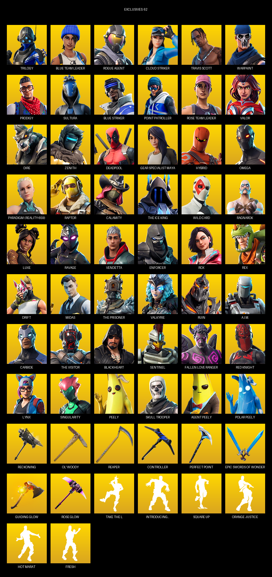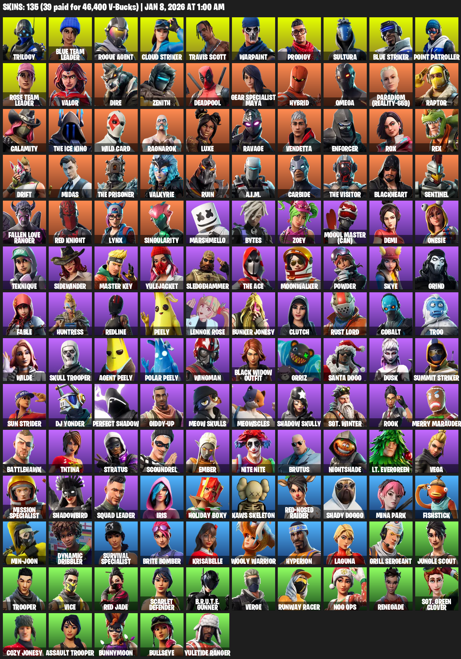 Travis Scott, Point Patroller, Gear Specialist Maya, Omega, Trilogy, Blue Team Leader, Rogue Agent, Cloud Striker, Warpaint, Prodigy, Sultura, Valor, Dire, Zenith, Deadpool, Hybrid, Paradigm (Reality-659), Raptor