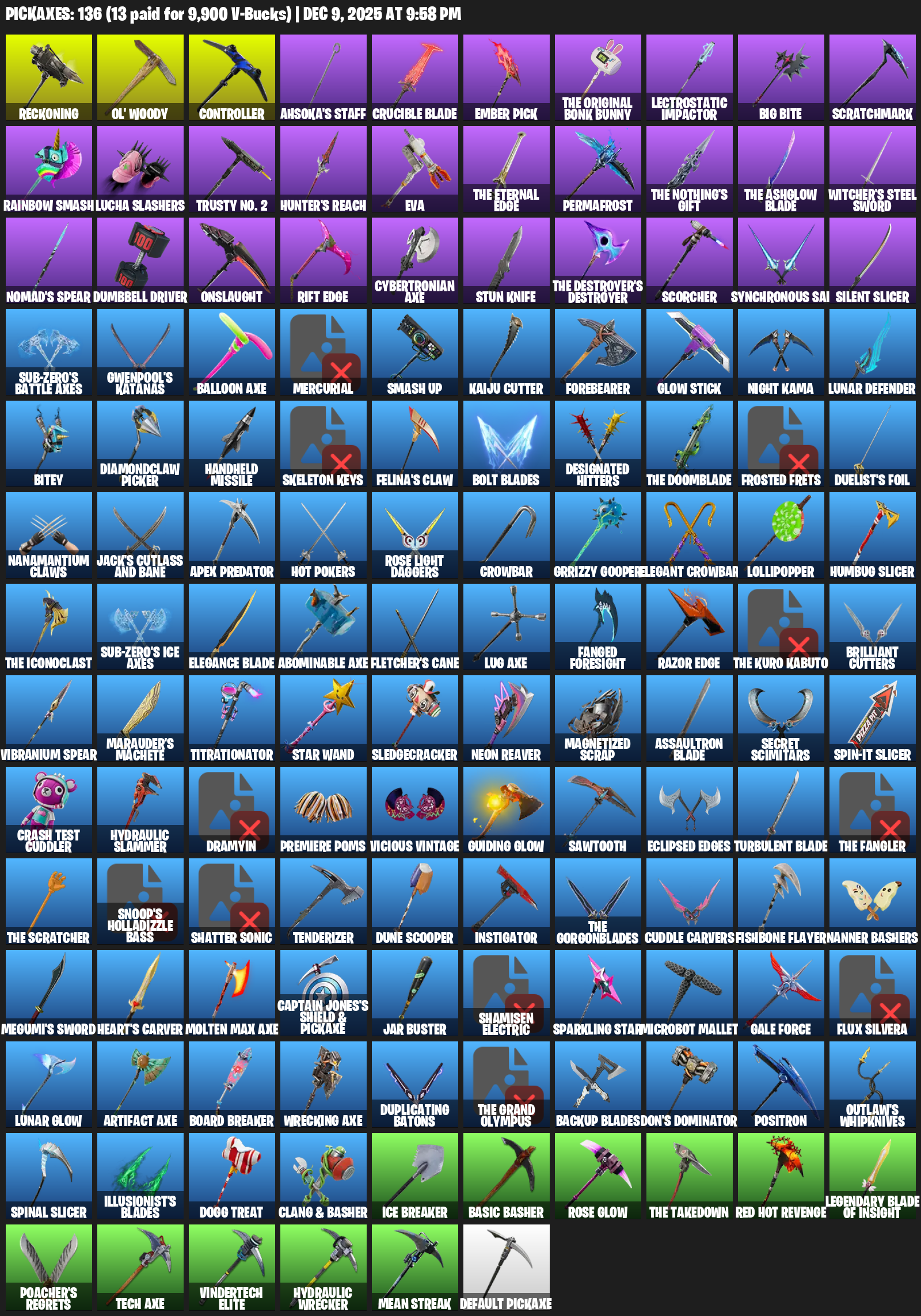 Reckoning, Ol’ Woody, Controller, Ahsoka’s Staff, Crucible Blade, Ember Pick, Lectrostatic Impactor, Big Bite, Scratchmark, Rainbow Smash, Lucha Slashers, Trusty No. 2, Hunter’s Reach, EVA, Permafrost, Witcher’s Steel Sword