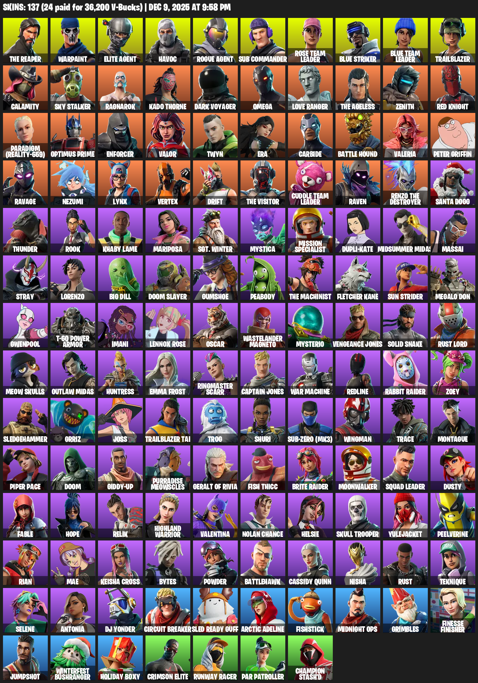 The Reaper, Elite Agent, Omega, Warpaint, Havoc, Sub Commander, Rose Team Leader, Blue Striker, Trailblazer, Calamity, Sky Stalker, Ragnarok, Kado Thorne, Dark Voyager, Love Ranger, Zenith, Red Knight