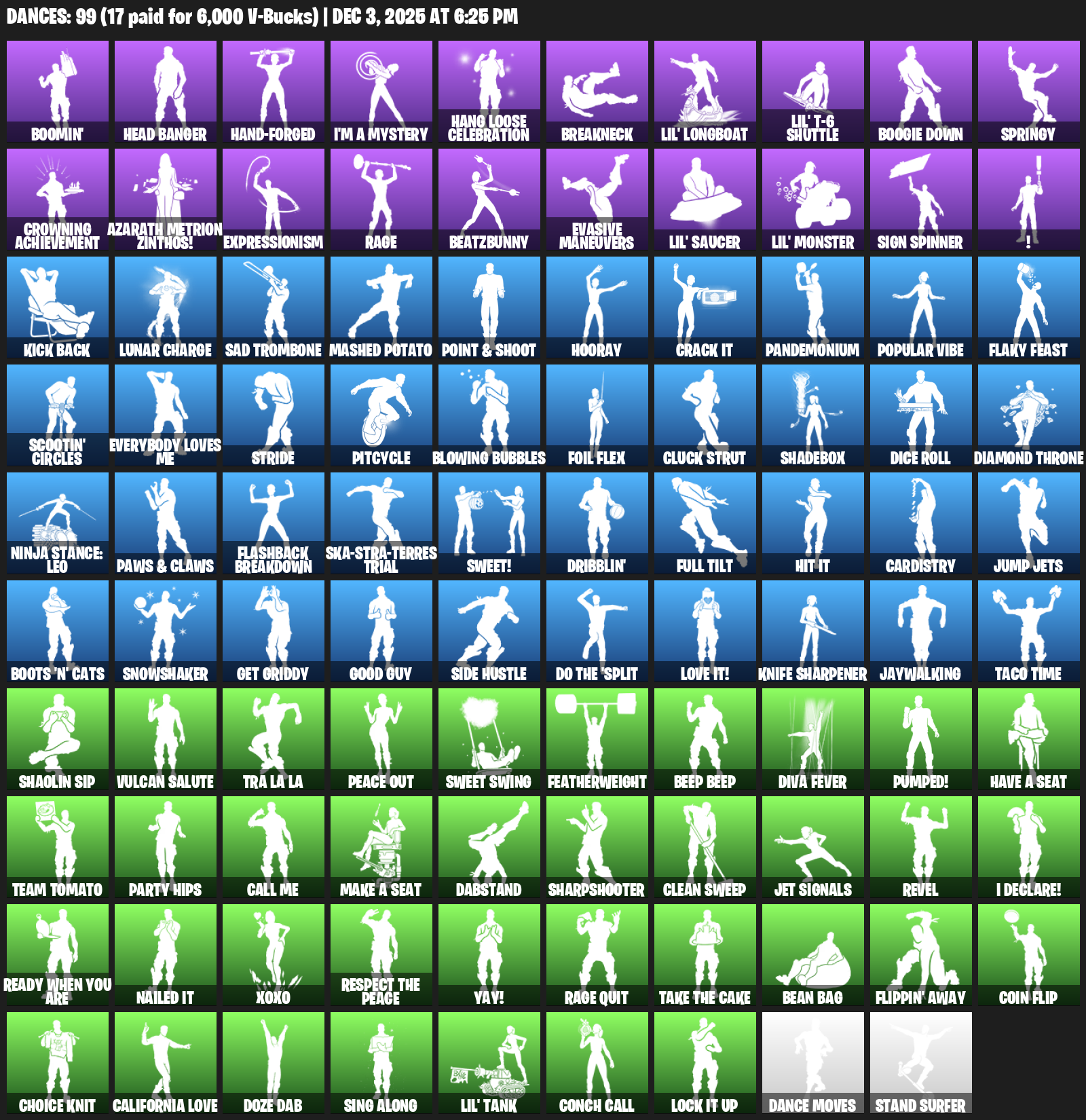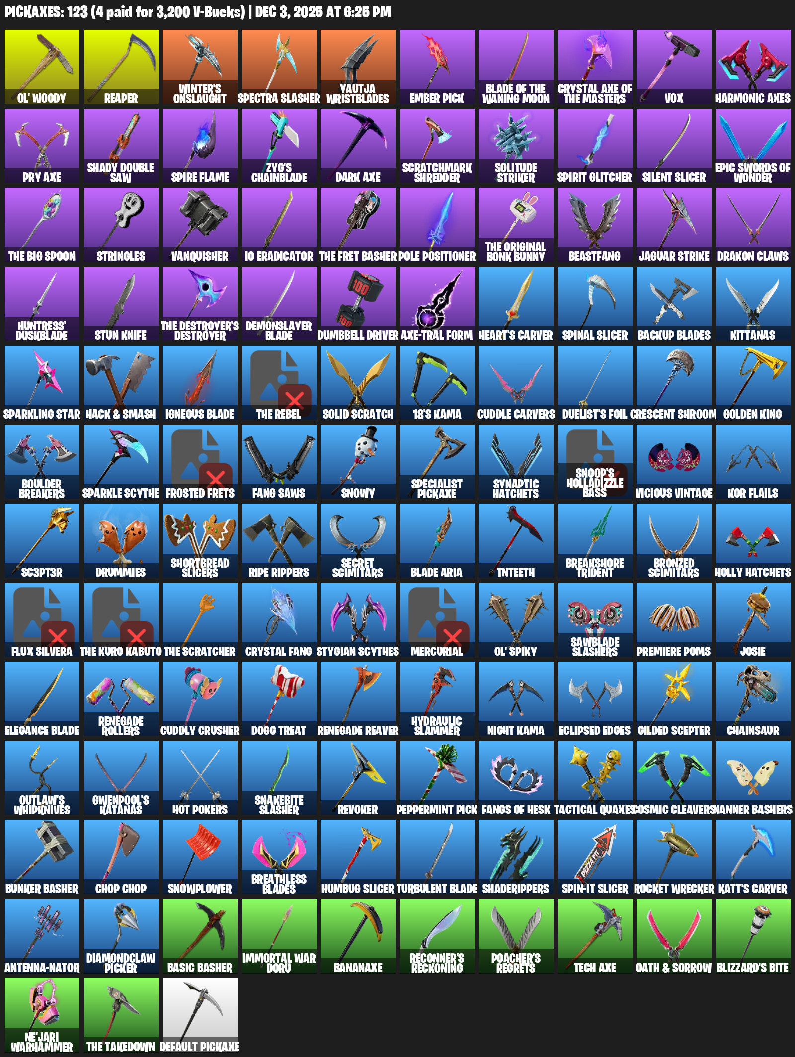 Ol’ Woody, Reaper, Winter’s Onslaught, Spectra Slasher, Yautja Wristblades, Ember Pick, Vox, Harmonic Axes, Pry Axe, Shady Double Saw, Spire Flame, Zyg’s Chainblade, Scratchmark Shredder, Spirit Glitcher, Silent Slicer