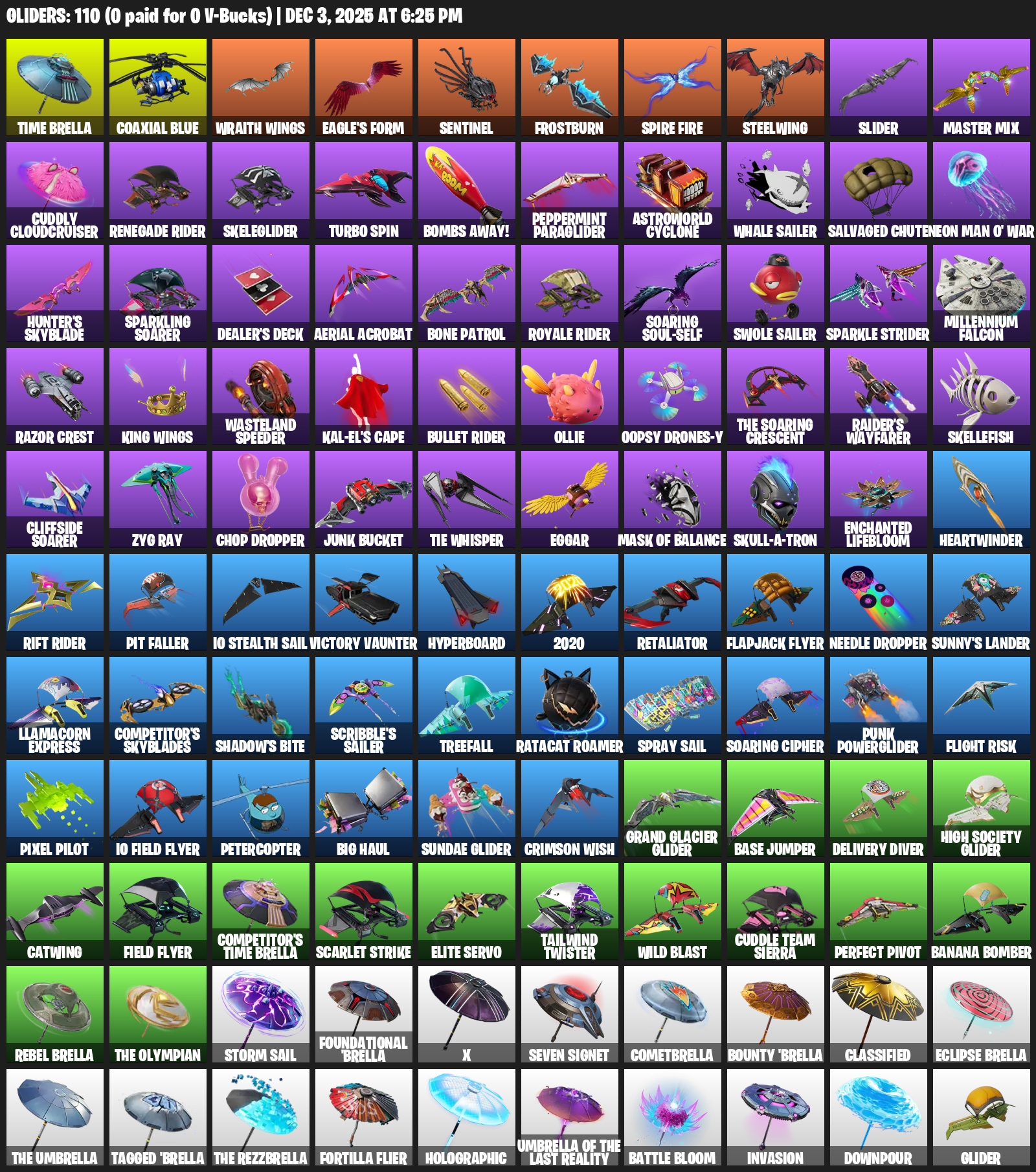 Time Brella, Coaxial Blue, Wraith Wings, Eagle’s Form, Sentinel, Frostburn, Steelwing, Slider, Master Mix, Cuddly Cloudcruiser, Skeleglider, Turbo Spin, Bombs Away!, Peppermint Paraglider, Astroworld Cyclone, Whale Sailer, Salvaged Chute, Neon Man O’ War