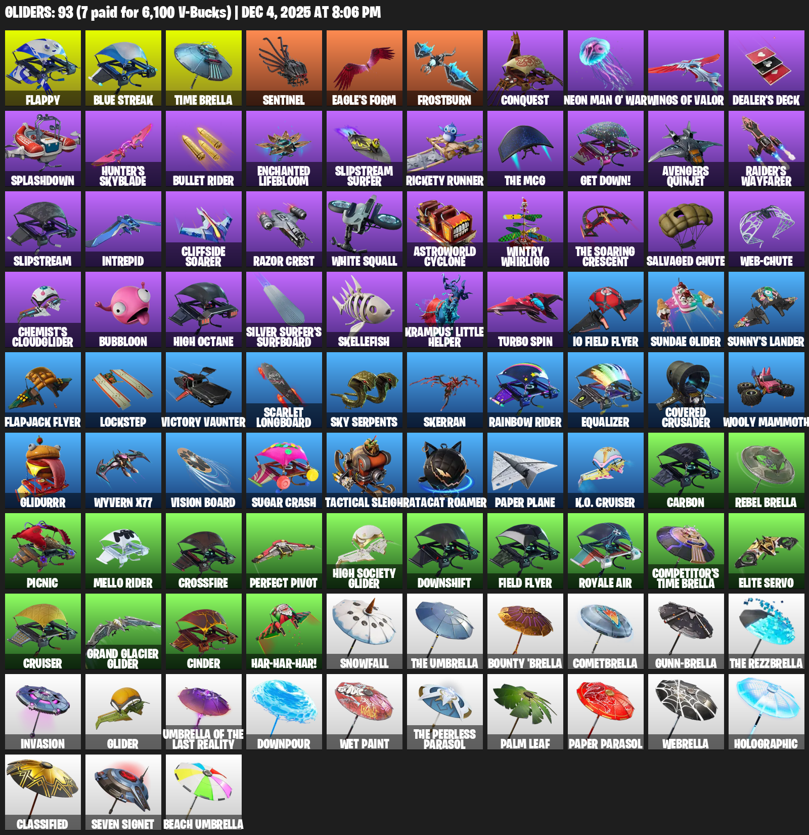 Flappy, Time Brella, Sentinel, Eagle’s Form, Frostburn, Conquest, Neon Man O’ War, Wings of Valor, Dealer’s Deck, Splashdown, Hunter’s Skyblade, Bullet Rider, Enchanted Lifebloom, Slipstream Surfer, Rickety Runner, Get Down!, Avengers Quinjet, Raider’s Wayfarer
