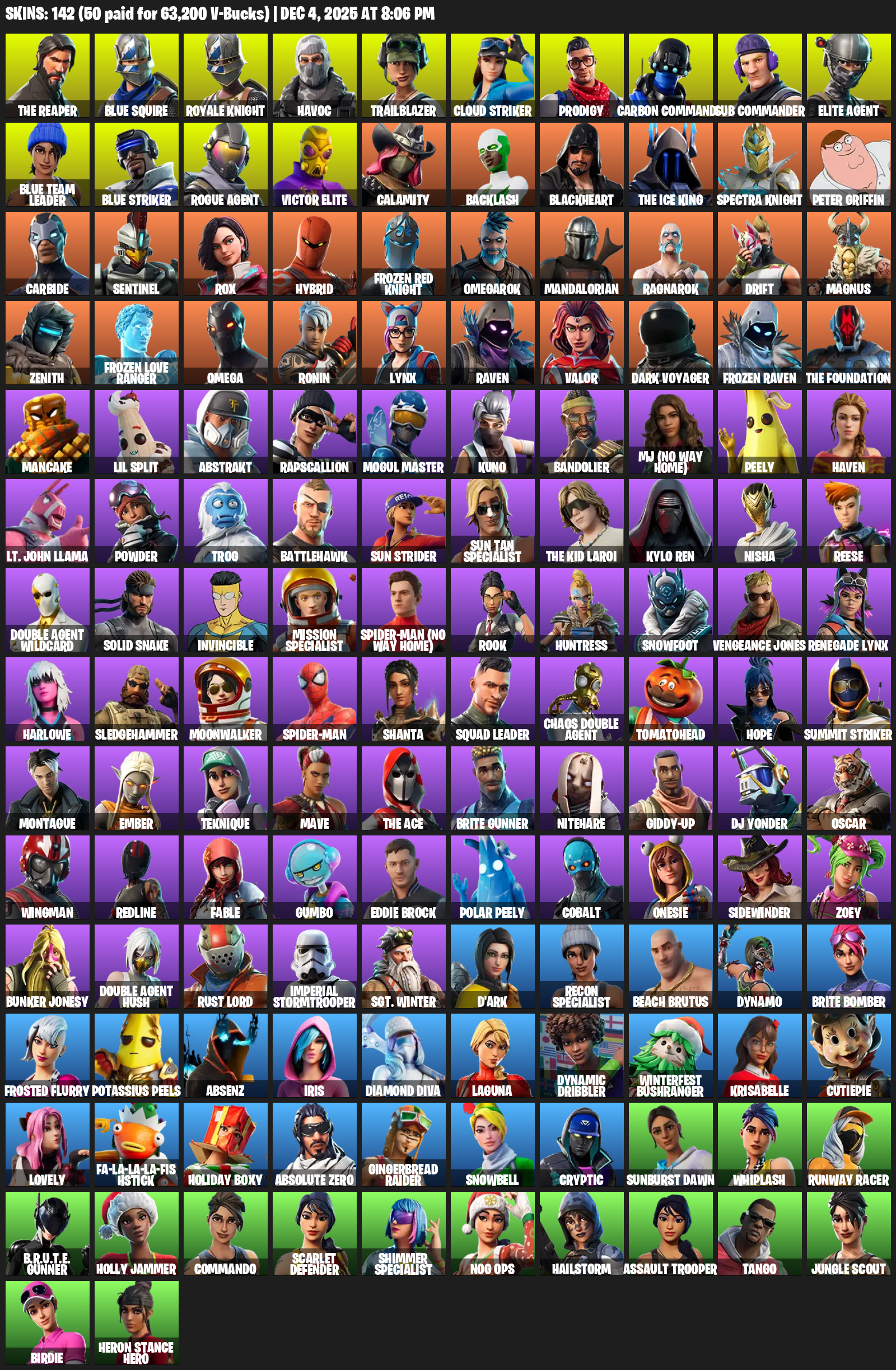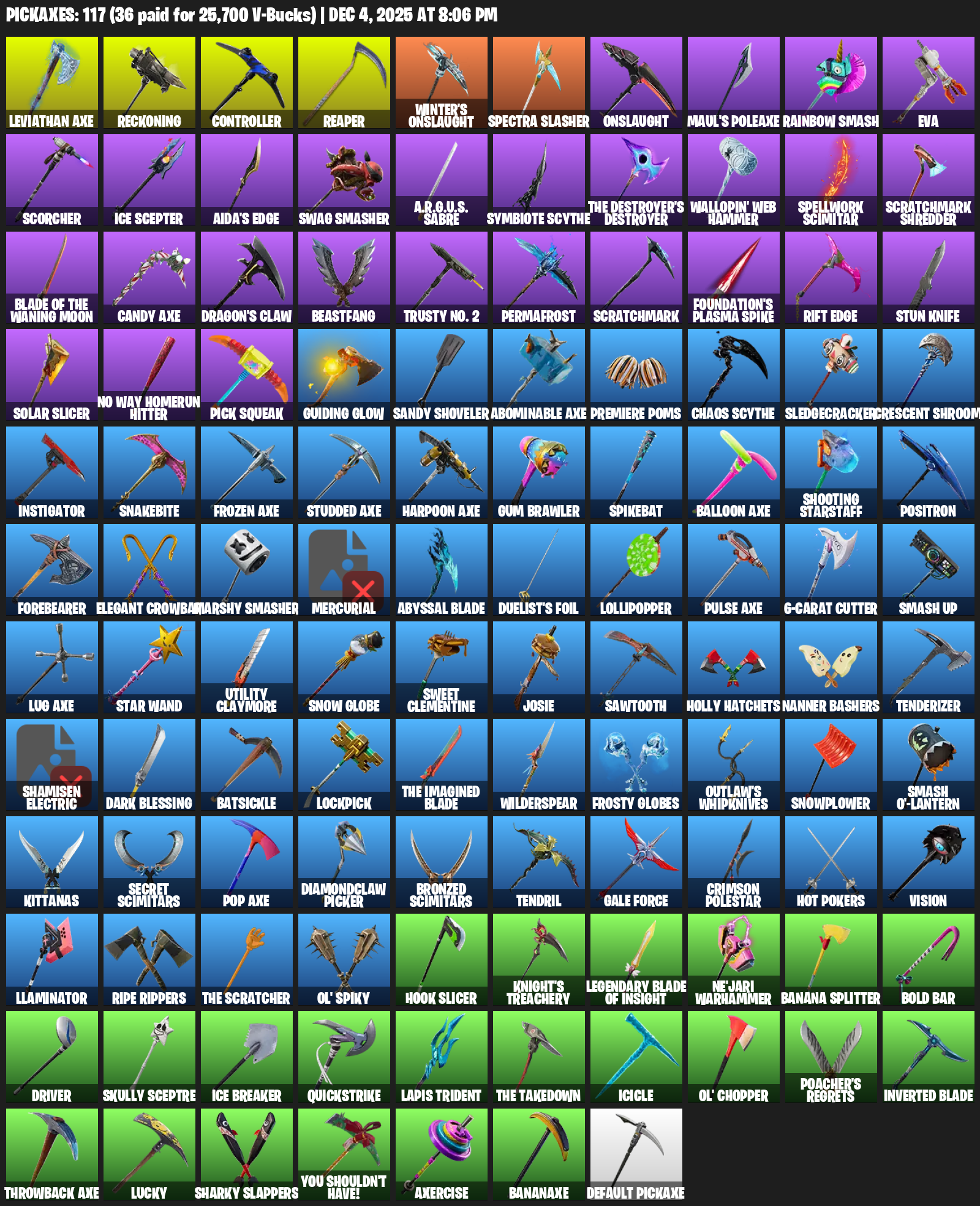 Leviathan Axe, Reckoning, Controller, Winter’s Onslaught, Spectra Slasher, Maul’s Poleaxe, Rainbow Smash, EVA, Scorcher, Ice Scepter, Aida’s Edge, Swag Smasher, A.R.G.U.S. Sabre, Symbiote Scythe, Wallopin’ Web Hammer, Spellwork Scimitar, Scratchmark Shredder