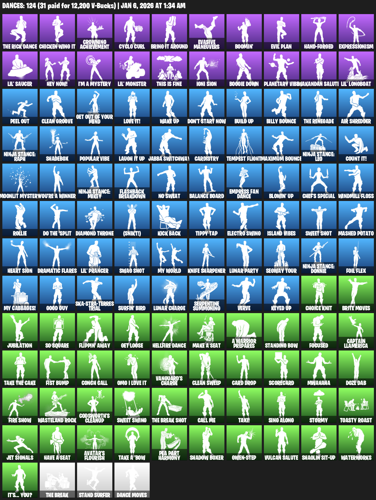 Chicken Wing It, Crowning Achievement, Cyclo Curl, Evasive Maneuvers, Boomin’, Evil Plan, Expressionism, Lil’ Saucer, Hey Now!, I’m a Mystery, This is Fine, Igni Sign, Boogie Down, Planetary Vibe, Wakandan Salute