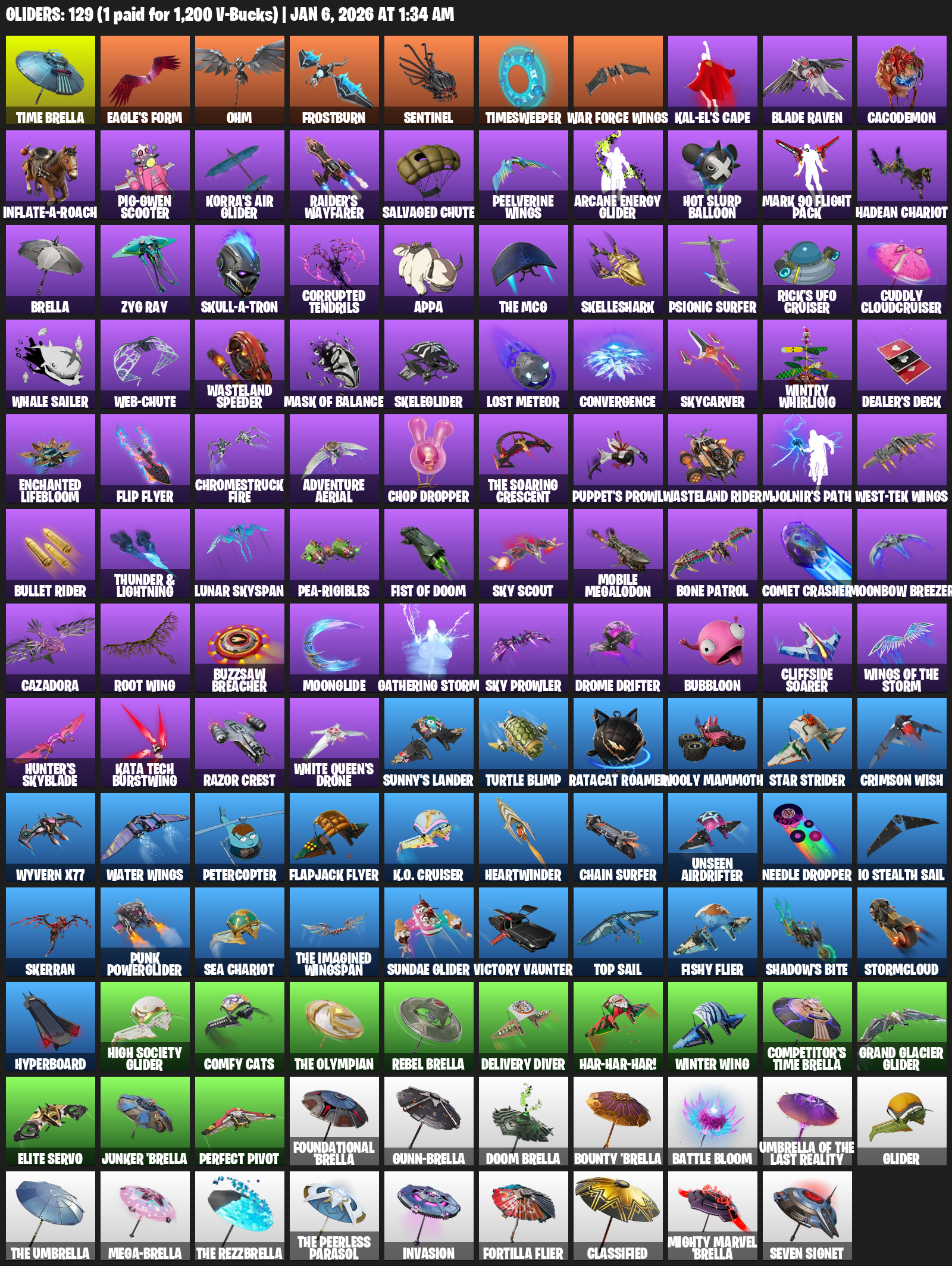 Time Brella, Eagle’s Form, Ohm, Frostburn, Sentinel, Timesweeper, War Force Wings, Kal-El’s Cape, Blade Raven, Cacodemon, Pig-Gwen Scooter, Korra’s Air Glider, Raider’s Wayfarer, Salvaged Chute, Hot Slurp Balloon, Mark 90 Flight Pack