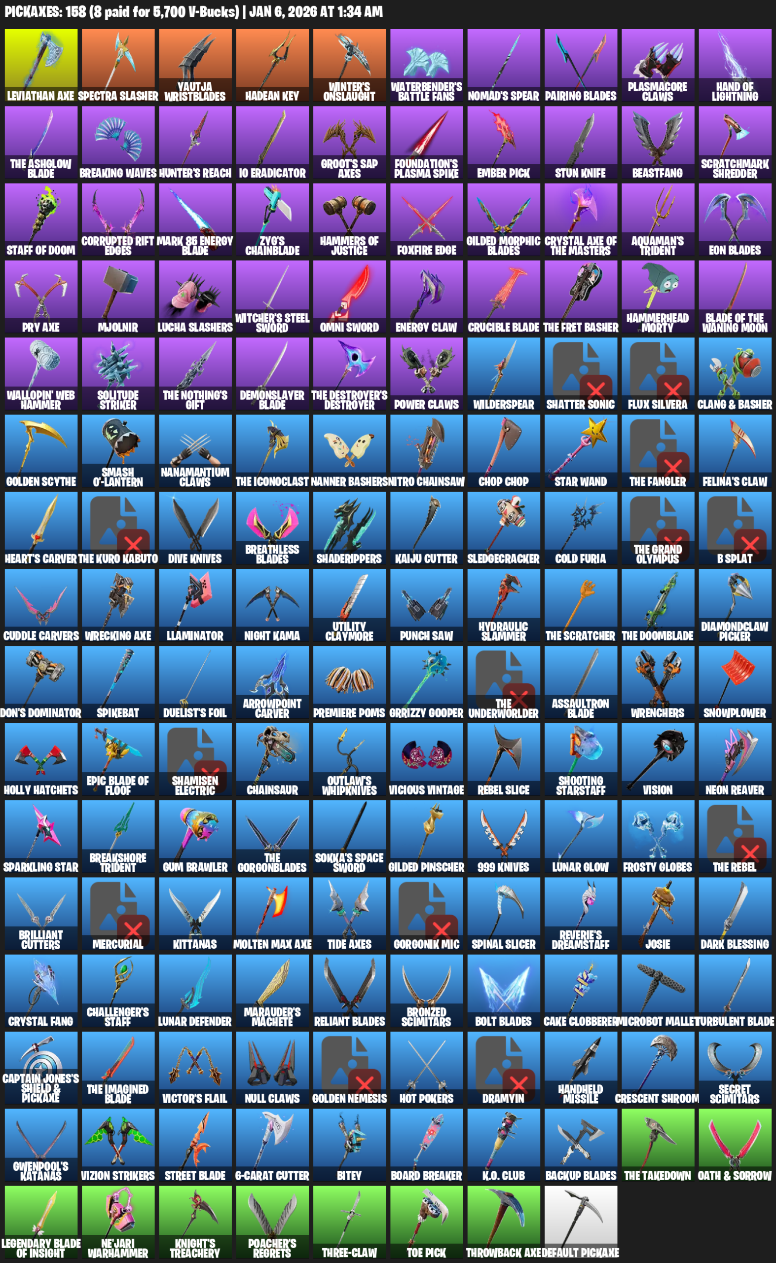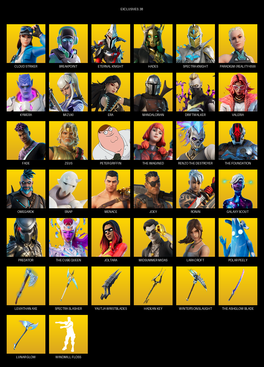 Leviathan Axe, Spectra Slasher, Yautja Wristblades, Hadean Key, Winter’s Onslaught, Waterbender’s Battle Fans, Nomad’s Spear, Pairing Blades, Plasmacore Claws, Hand of Lightning, Breaking Waves, Hunter’s Reach, IO Eradicator, Groot’s Sap Axes, Foundation’s Plasma Spike, Ember Pick, Stun Knife, Beastfang, Scratchmark Shredder