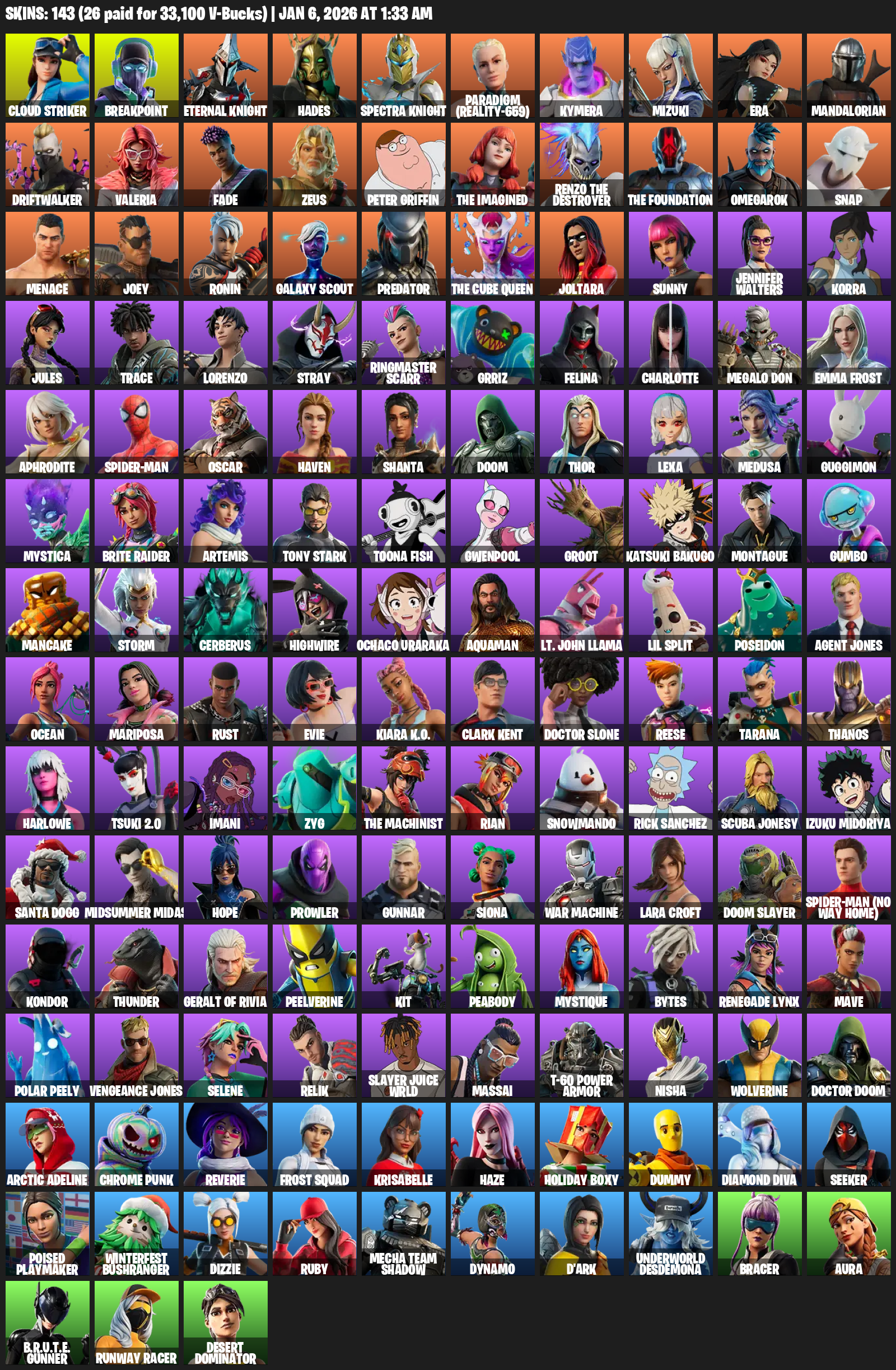 Lara Croft, Cloud Striker, Breakpoint, Eternal Knight, Hades, Paradigm (Reality-659), Kymera, Mizuki, Era, Mandalorian, Driftwalker, Valeria, Fade, Zeus, Peter Griffin, The Imagined, Omegarok