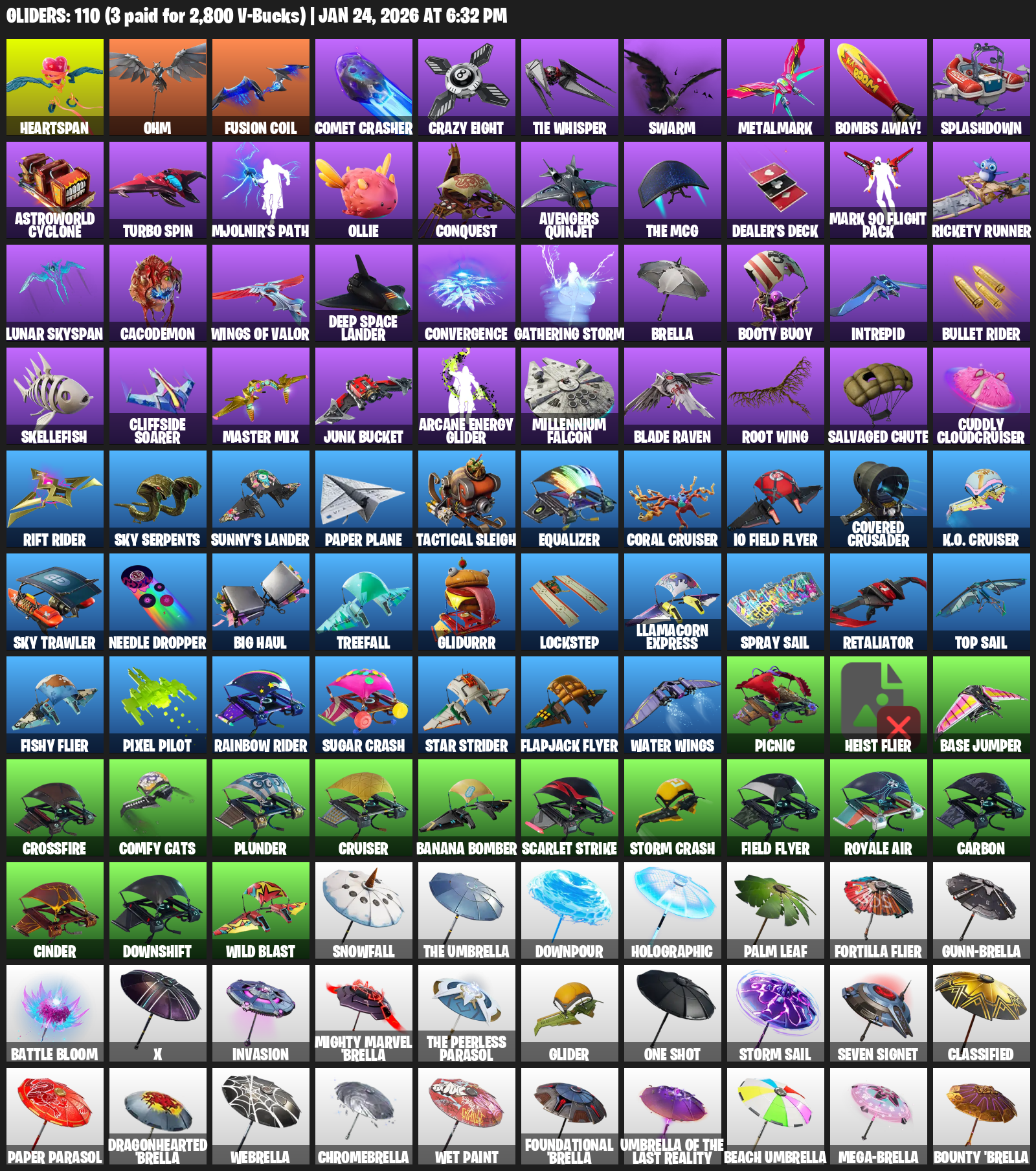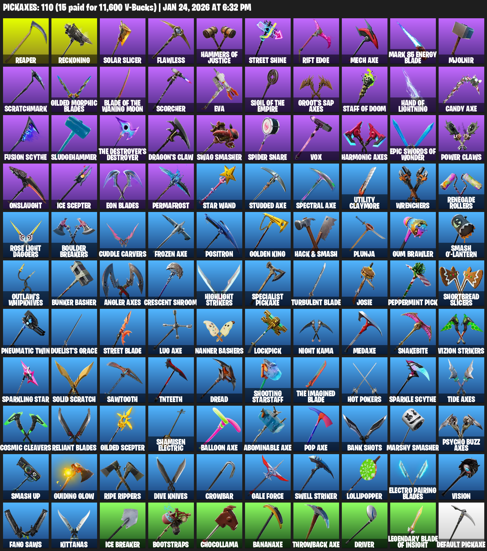 Reaper, Reckoning, Solar Slicer, Flawless, Hammers of Justice, Street Shine, Rift Edge, Mech Axe, Mark 85 Energy Blade, Mjolnir, Scratchmark, Gilded Morphic Blades, Scorcher, EVA, Groot’s Sap Axes