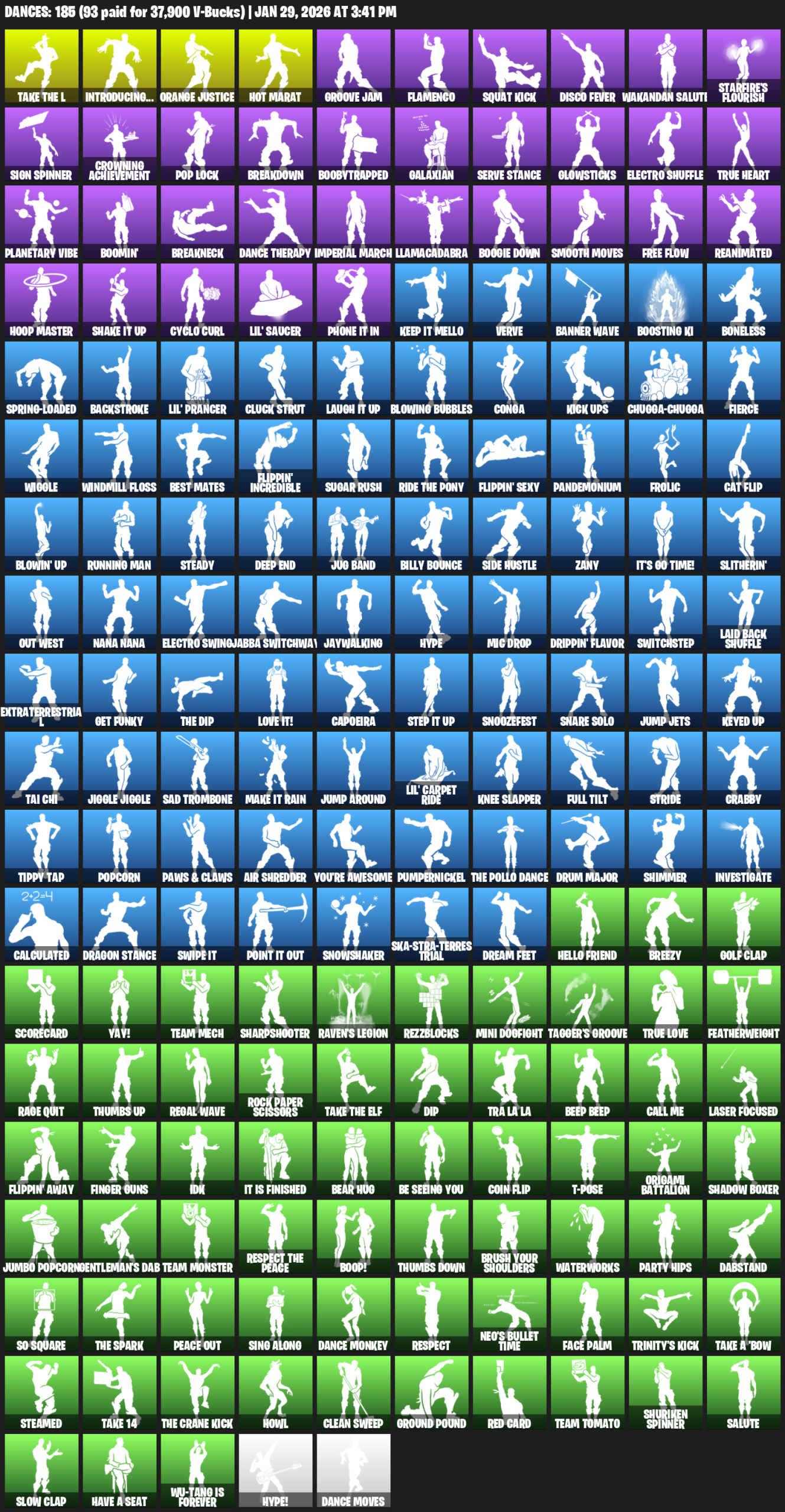 Introducing…, Hot Marat, Groove Jam, Flamenco, Squat Kick, Disco Fever, Wakandan Salute, Starfire’s Flourish, Sign Spinner, Crowning Achievement, Pop Lock, Breakdown, Boobytrapped, GALAXIAN, Serve Stance, Glowsticks, Electro Shuffle, True Heart