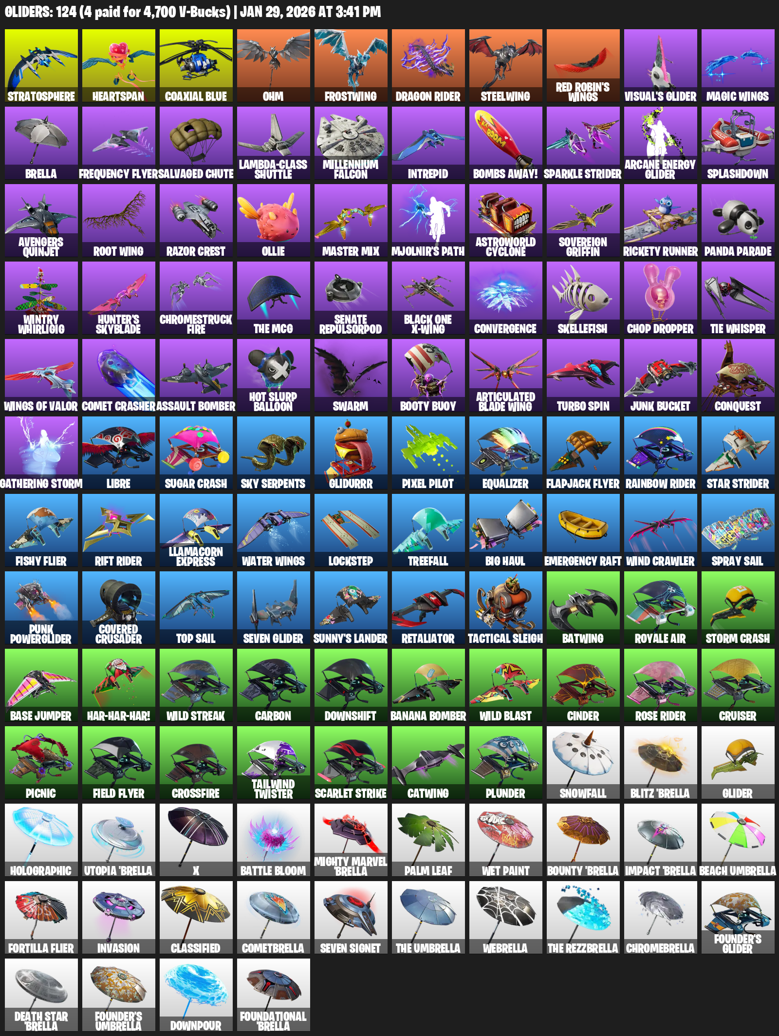 Stratosphere, Heartspan, Coaxial Blue, Ohm, Frostwing, Steelwing, Visual’s Glider, Magic Wings, Brella, Frequency Flyer, Salvaged Chute, Lambda-Class Shuttle, Millennium Falcon, Intrepid, Bombs Away!, Sparkle Strider, Splashdown