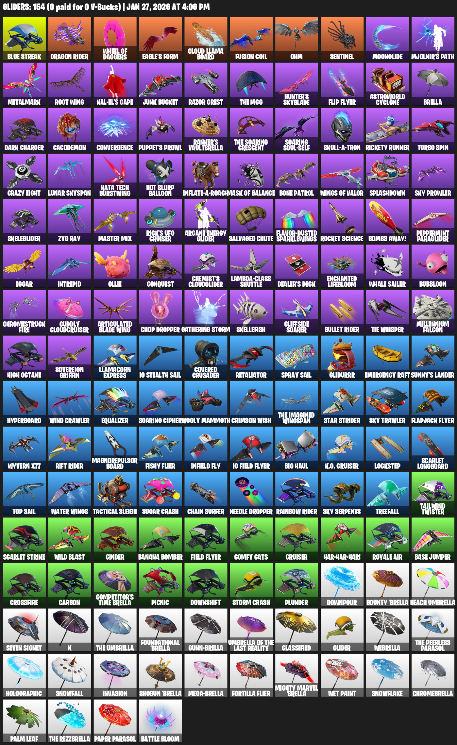 Dragon Rider, Eagle’s Form, Cloud Llama Board, Fusion Coil, Ohm, Moonglide, Mjolnir’s Path, Metalmark, Root Wing, Kal-El’s Cape, Junk Bucket, Razor Crest, Hunter’s Skyblade, Flip Flyer, Astroworld Cyclone, Brella