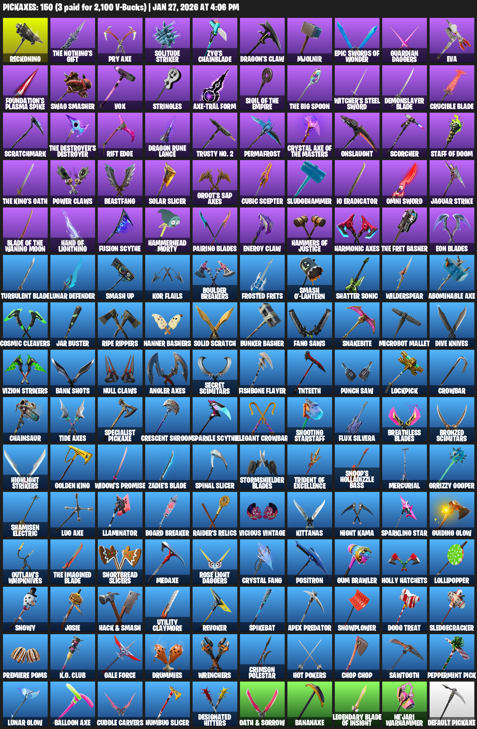 Reckoning, Pry Axe, Solitude Striker, Zyg’s Chainblade, Dragon’s Claw, Mjolnir, Guardian Daggers, EVA, Foundation’s Plasma Spike, Swag Smasher, Vox, Stringles, Witcher’s Steel Sword, Demonslayer Blade