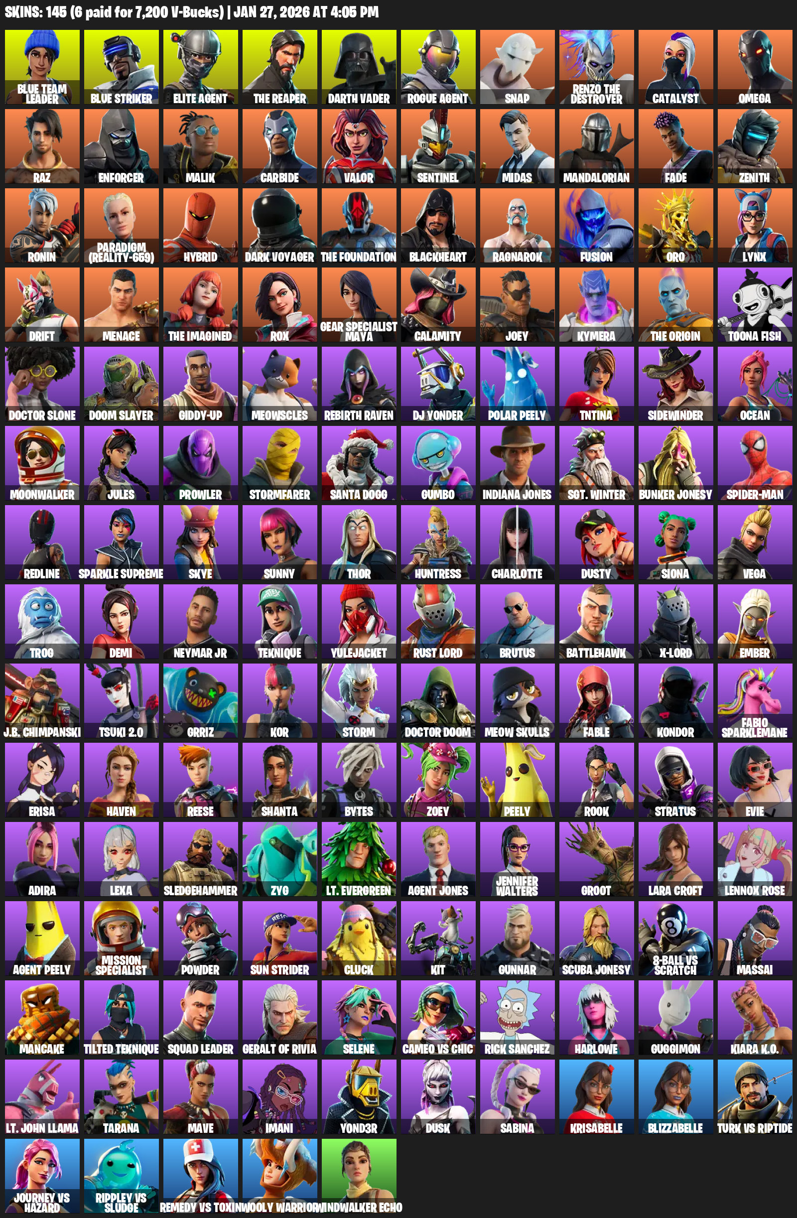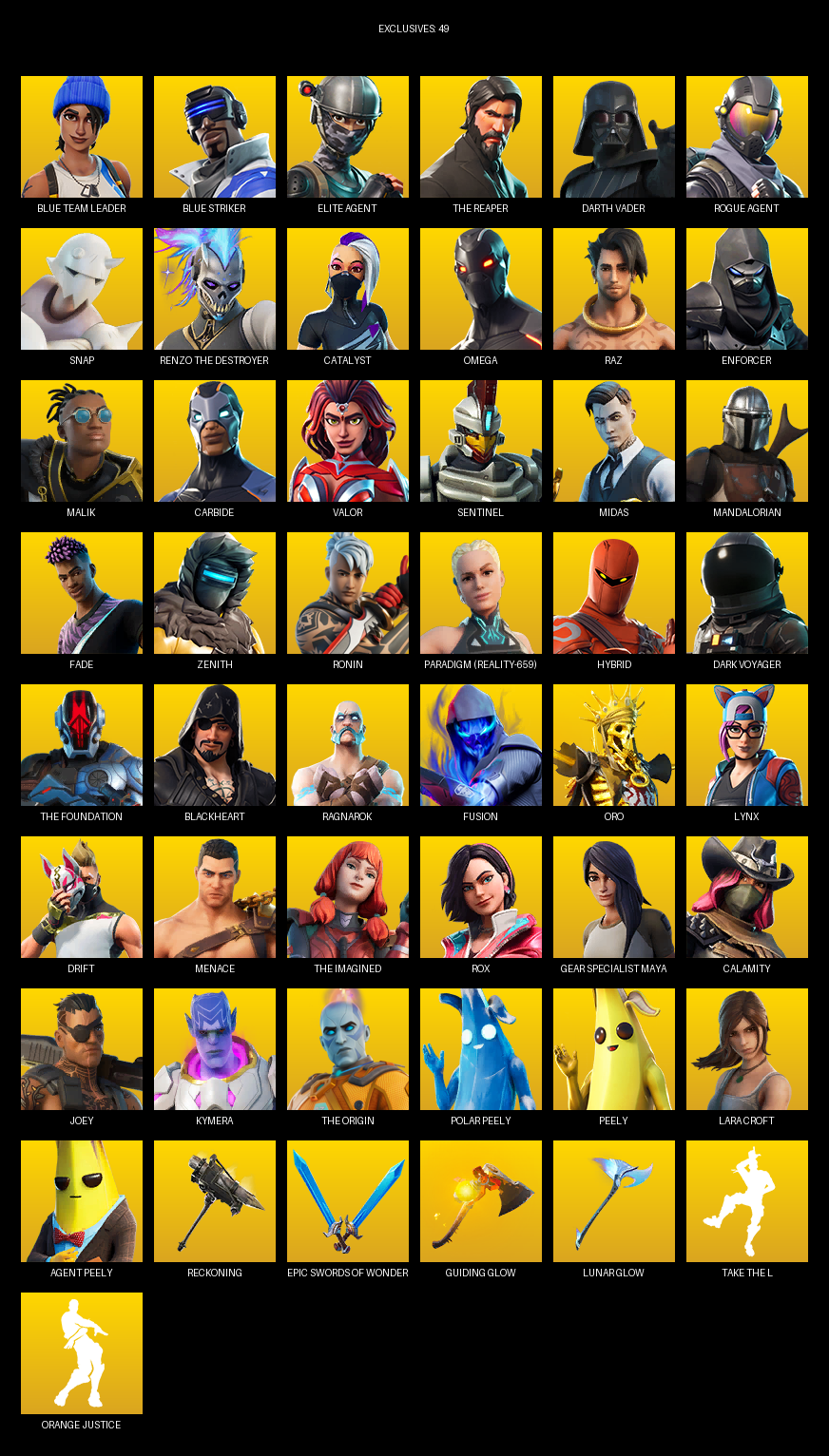 Elite Agent, The Reaper, Omega, Gear Specialist Maya, Lara Croft, Blue Team Leader, Darth Vader, Snap, Catalyst, Raz, Enforcer, Malik, Carbide, Valor, Sentinel, Midas, Mandalorian