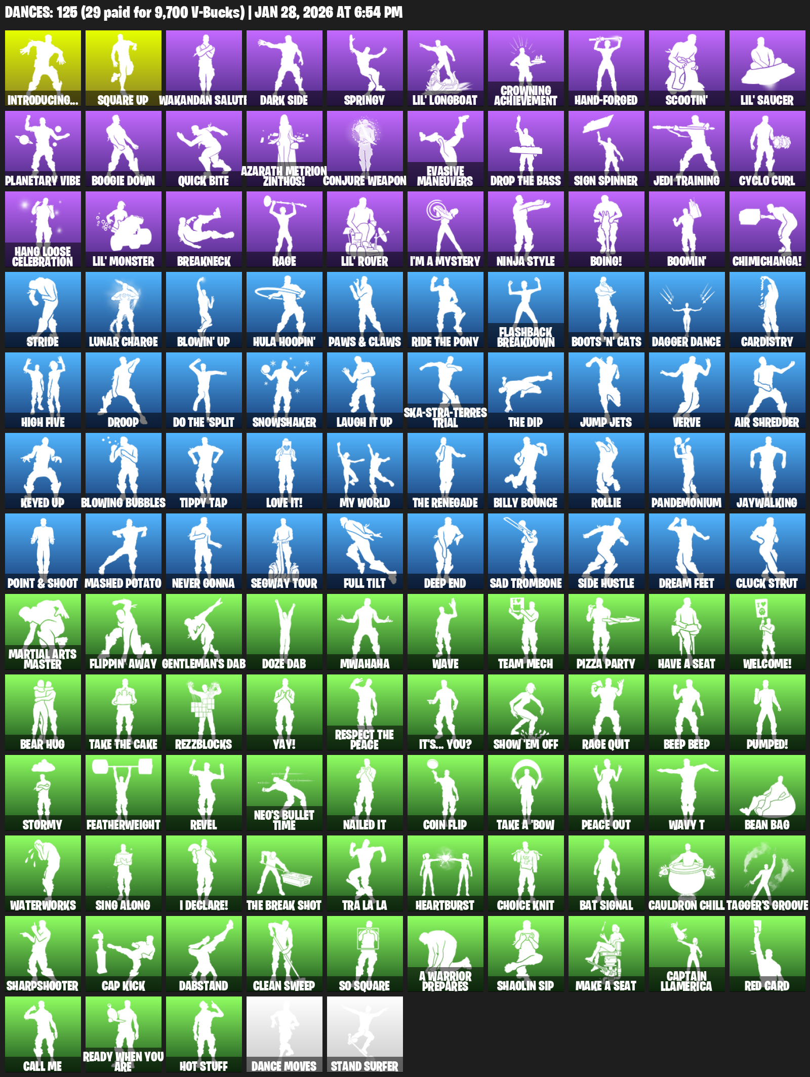 Introducing…, Square Up, Wakandan Salute, Dark Side, Springy, Lil’ Longboat, Crowning Achievement, Hand-Forged, Scootin’, Planetary Vibe, Boogie Down, Quick Bite, Azarath Metrion Zinthos!, Conjure Weapon, Evasive Maneuvers, Sign Spinner, Jedi Training, Cyclo Curl