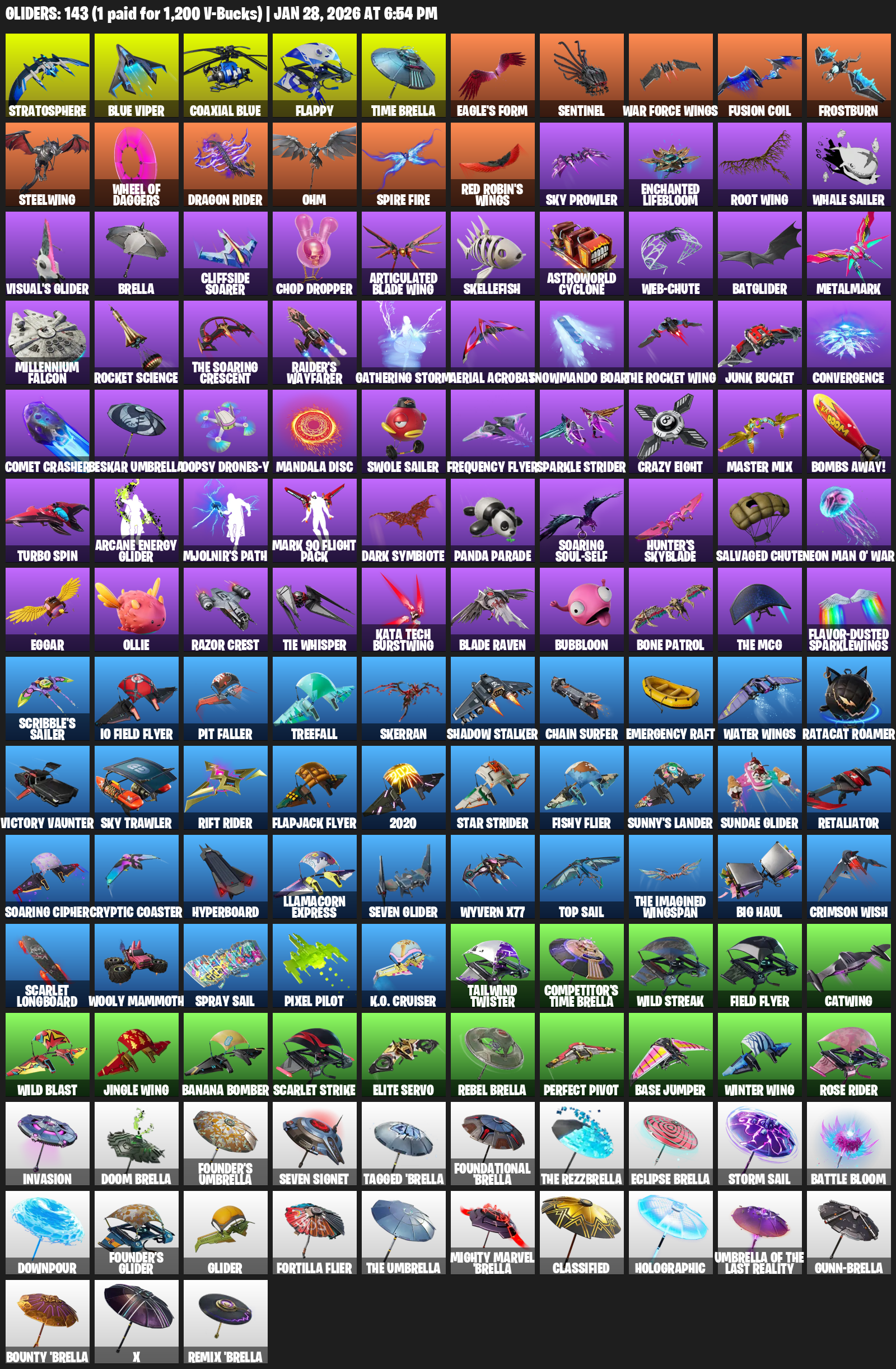 Stratosphere, Blue Viper, Flappy, Time Brella, Eagle’s Form, War Force Wings, Fusion Coil, Frostburn, Steelwing, Ohm, Spire Fire, Sky Prowler, Enchanted Lifebloom, Root Wing, Whale Sailer
