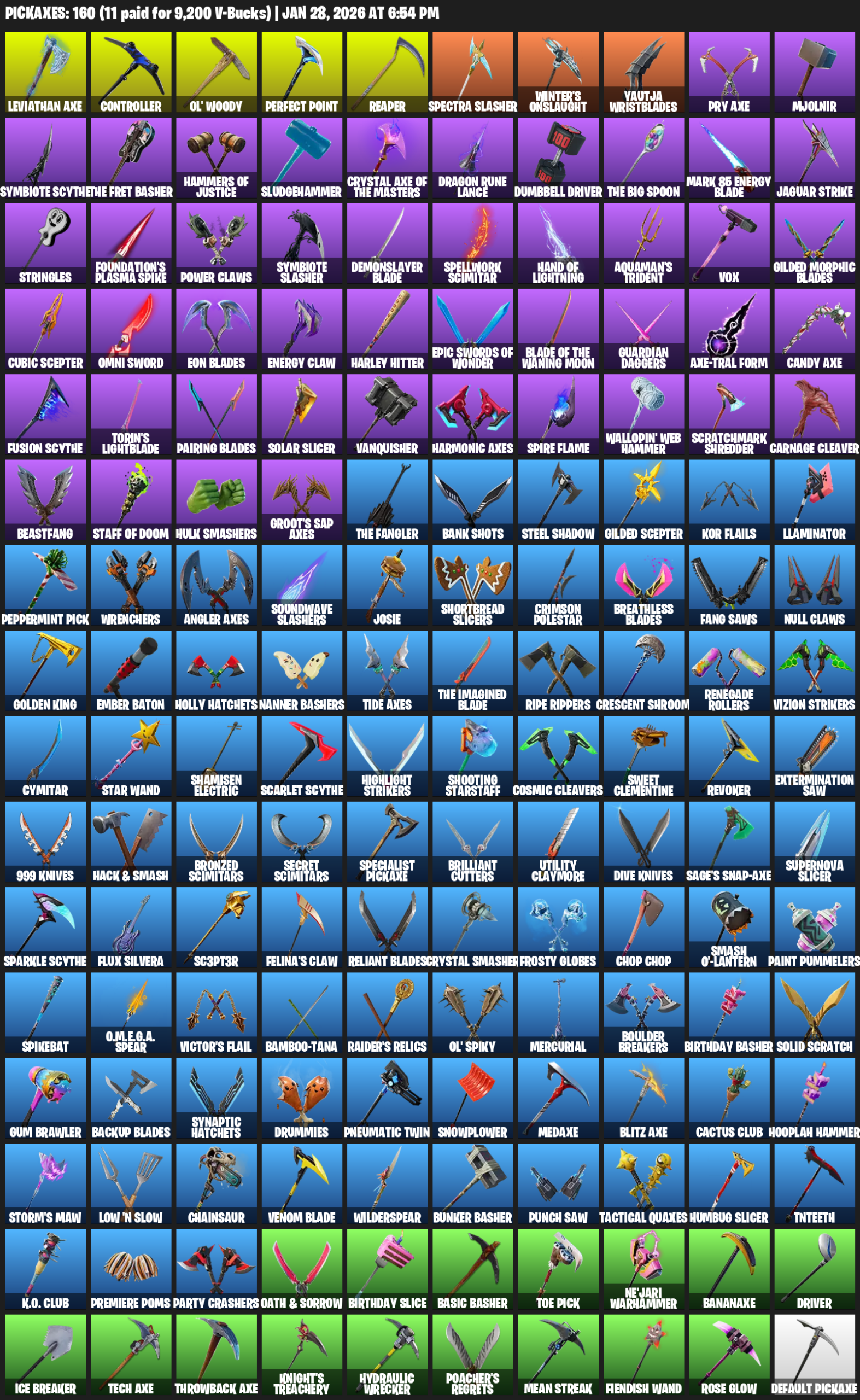 Leviathan Axe, Controller, Ol’ Woody, Reaper, Winter’s Onslaught, Yautja Wristblades, Mjolnir, Symbiote Scythe, Hammers of Justice, Sludgehammer, Dragon Rune Lance, Dumbbell Driver, Mark 85 Energy Blade, Jaguar Strike