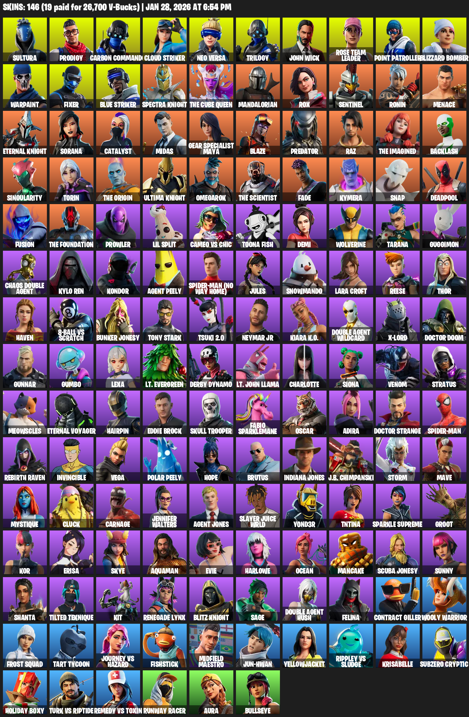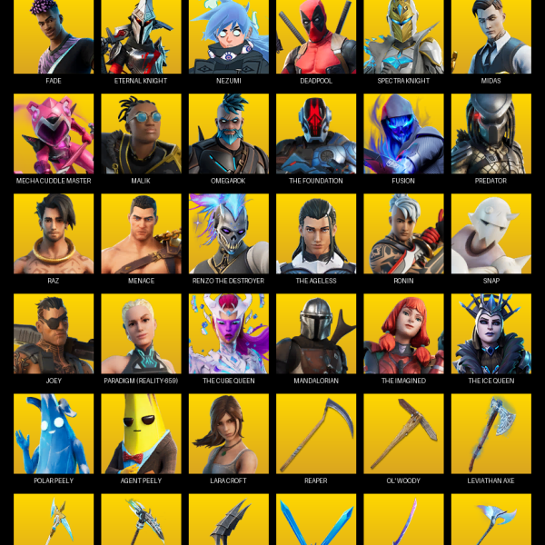 Point Patroller, Gear Specialist Maya, Lara Croft, Sultura, Prodigy, Carbon Commando, Cloud Striker, Neo Versa, Trilogy, John Wick, Rose Team Leader, Blizzard Bomber, Warpaint, Fixer, Spectra Knight, The Cube Queen, Mandalorian, Rox, Sentinel