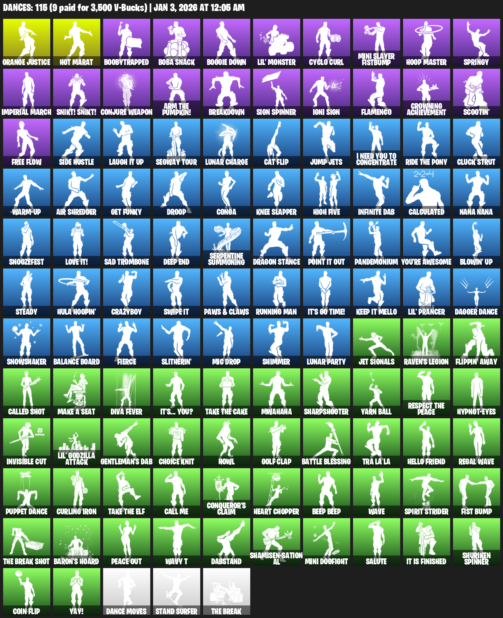 Hot Marat, Orange Justice, Boobytrapped, Boba Snack, Boogie Down, Lil’ Monster, Cyclo Curl, Mini Slayer Fistbump, Hoop Master, Springy, Imperial March, Snikt! Snikt!, Conjure Weapon, Breakdown, Sign Spinner, Flamenco, Crowning Achievement, Scootin’