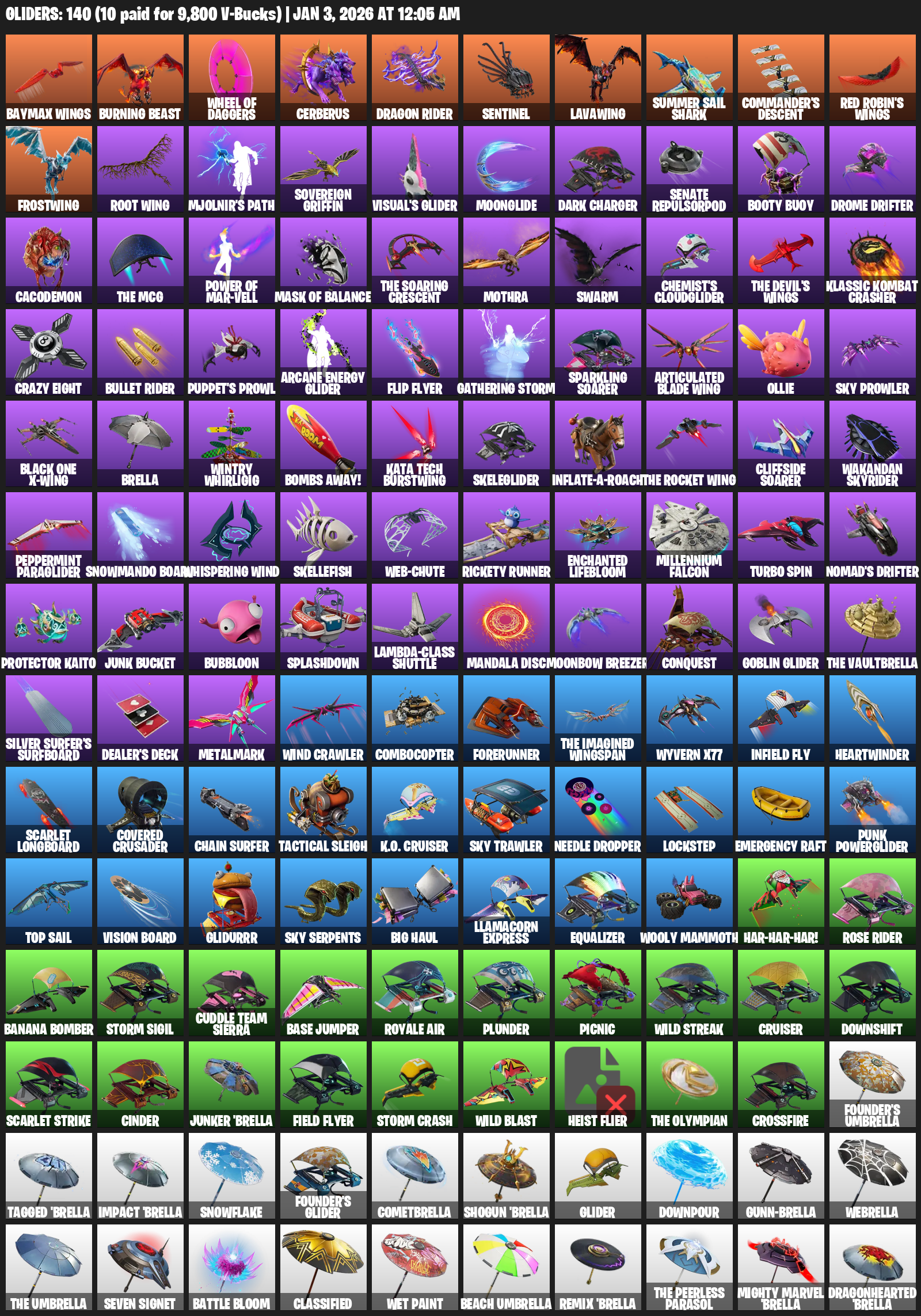 Baymax Wings, Burning Beast, Cerberus, Sentinel, Lavawing, Summer Sail Shark, Commander’s Descent, Frostwing, Root Wing, Mjolnir’s Path, Sovereign Griffin, Visual’s Glider, Moonglide, Dark Charger, Senate Repulsorpod, Booty Buoy, Drome Drifter