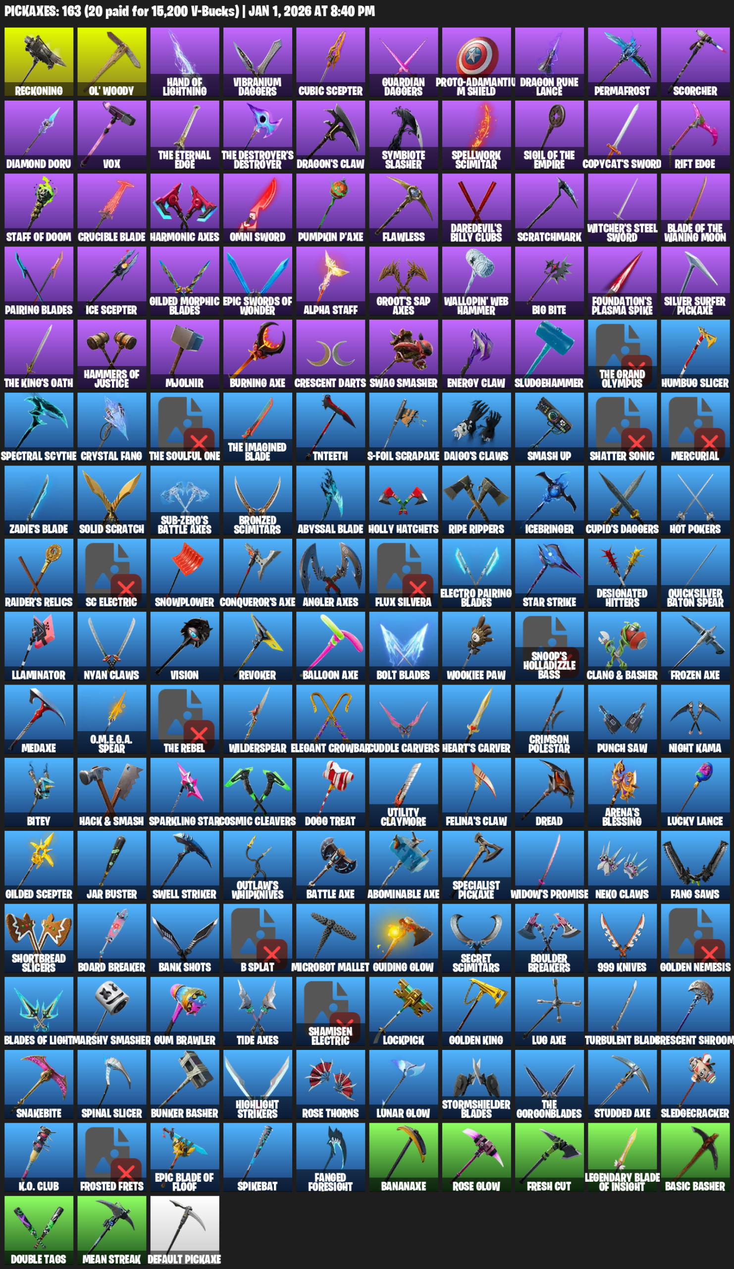 Reckoning, Ol’ Woody, Hand of Lightning, Vibranium Daggers, Cubic Scepter, Proto-Adamantium Shield, Dragon Rune Lance, Permafrost, Scorcher, Diamond Doru, Vox, Dragon’s Claw, Symbiote Slasher, Spellwork Scimitar, Copycat’s Sword, Rift Edge