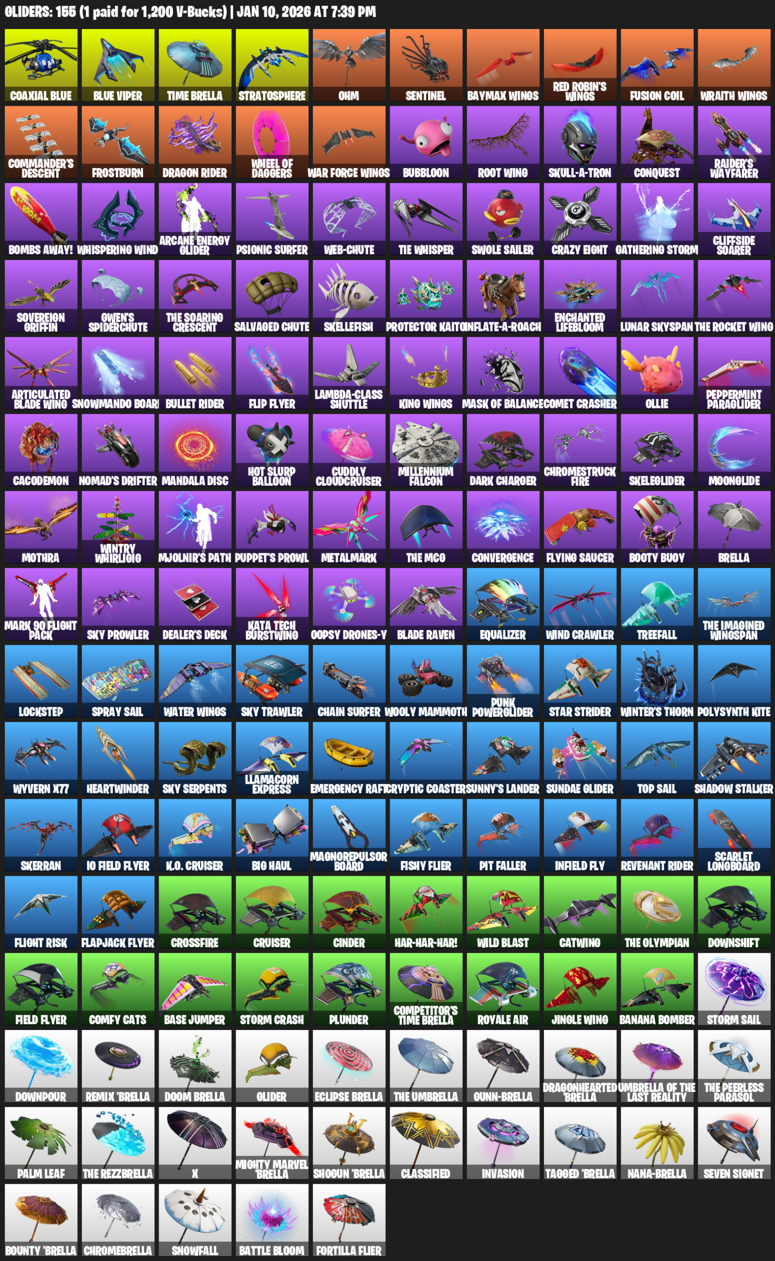 Coaxial Blue, Time Brella, Stratosphere, Ohm, Sentinel, Baymax Wings, Fusion Coil, Commander’s Descent, Frostburn, Dragon Rider, Bubbloon, Root Wing, Skull-a-tron, Conquest, Raider’s Wayfarer