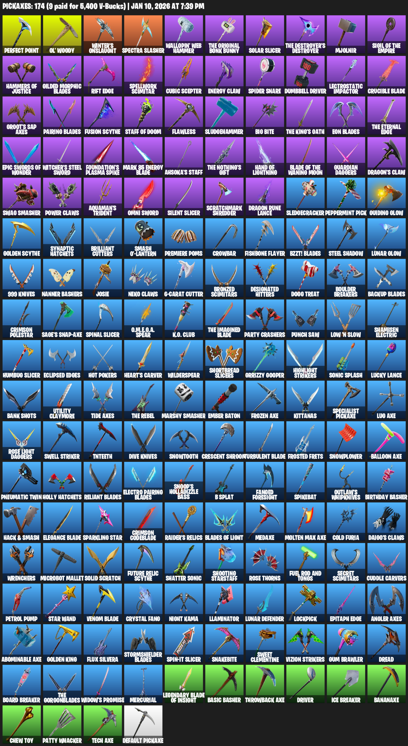 Ol’ Woody, Winter’s Onslaught, Spectra Slasher, Wallopin’ Web Hammer, Solar Slicer, Mjolnir, Hammers of Justice, Gilded Morphic Blades, Rift Edge, Spellwork Scimitar, Cubic Scepter, Energy Claw, Spider Snare, Dumbbell Driver, Lectrostatic Impactor, Crucible Blade