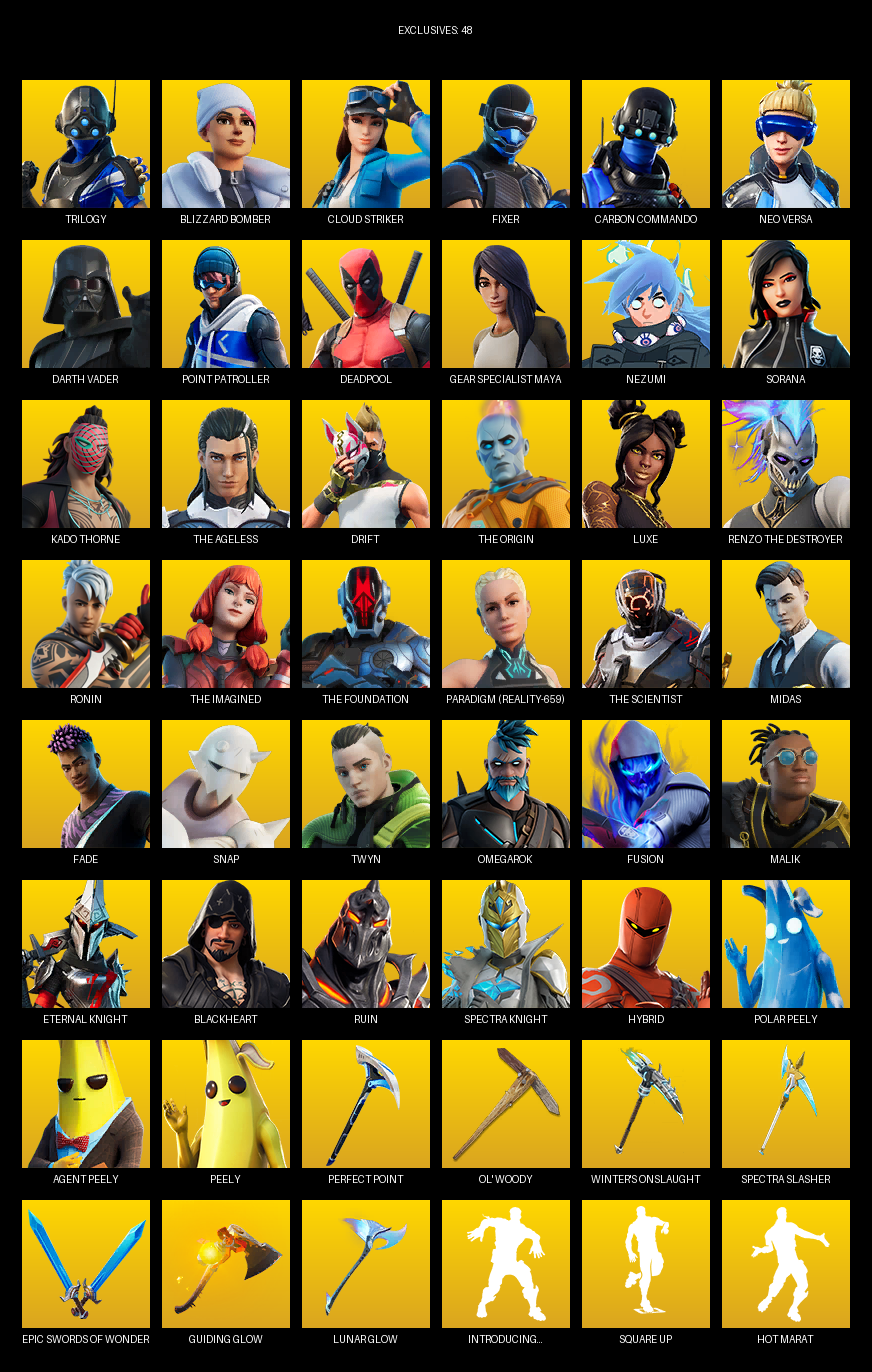 Point Patroller, Gear Specialist Maya, Trilogy, Blizzard Bomber, Cloud Striker, Fixer, Carbon Commando, Neo Versa, Darth Vader, Deadpool, Nezumi, Sorana, Kado Thorne, The Ageless, Drift, Luxe, Ronin