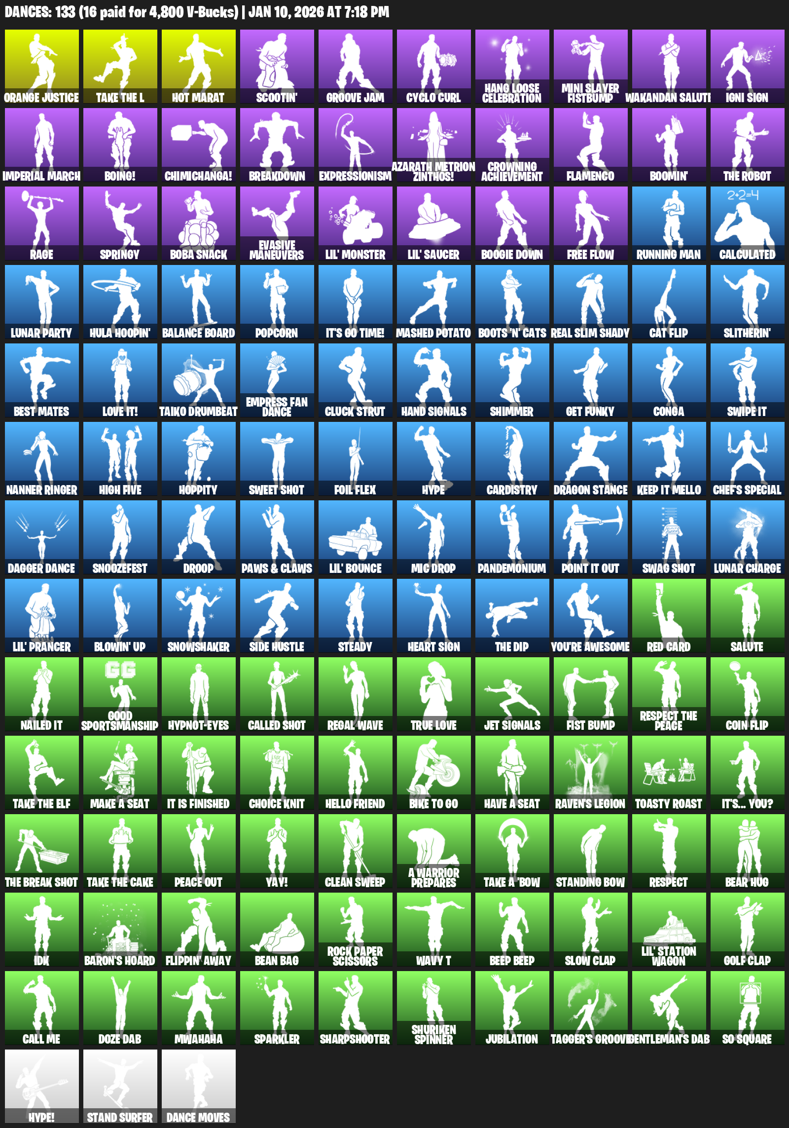 Hot Marat, Orange Justice, Scootin’, Groove Jam, Cyclo Curl, Hang Loose Celebration, Mini Slayer Fistbump, Wakandan Salute, Igni Sign, Imperial March, Boing!, Chimichanga!, Breakdown, Expressionism, Azarath Metrion Zinthos!, Crowning Achievement, Flamenco, Boomin’
