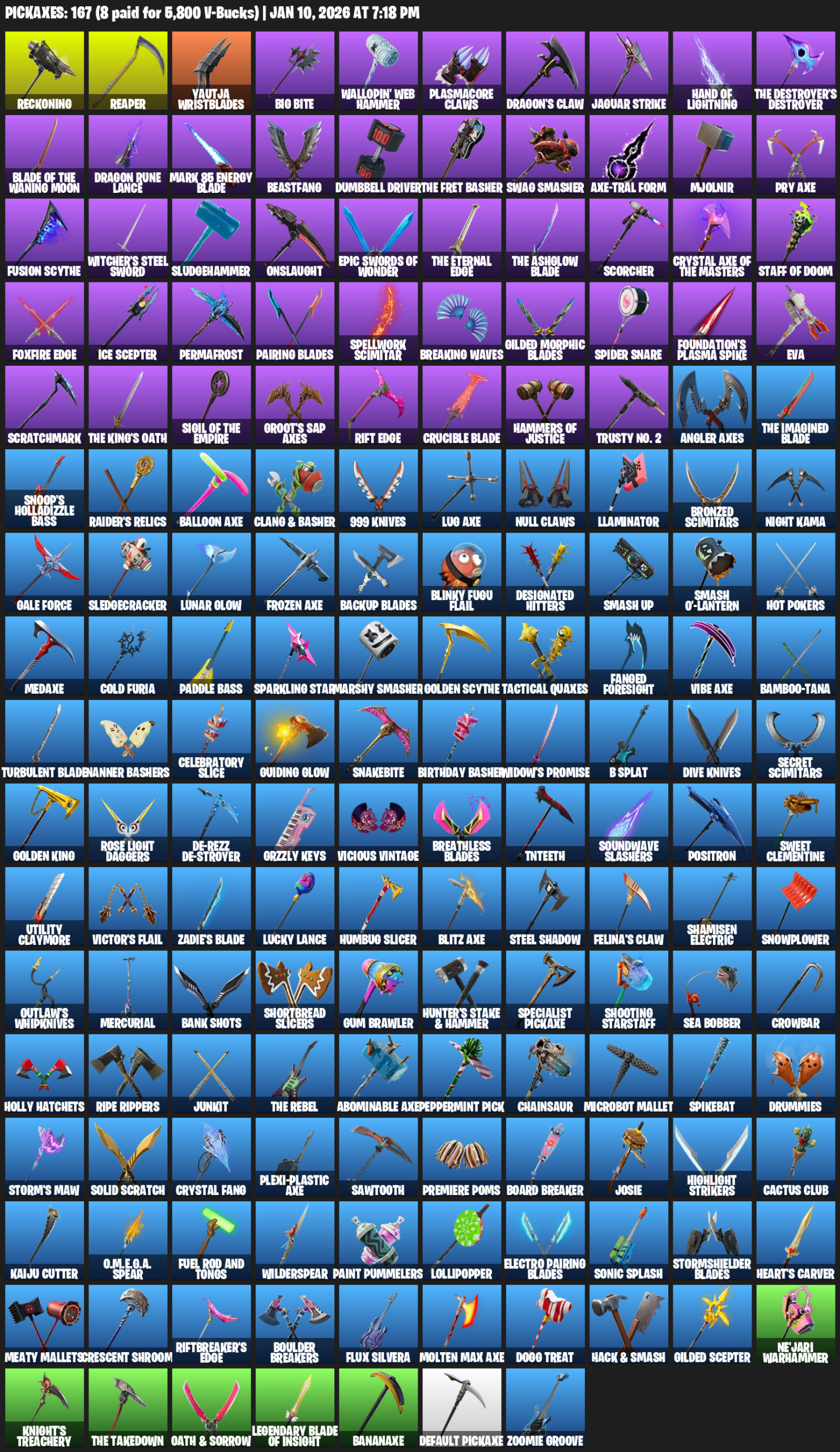 Reckoning, Yautja Wristblades, Big Bite, Wallopin’ Web Hammer, Plasmacore Claws, Dragon’s Claw, Jaguar Strike, Hand of Lightning, Dragon Rune Lance, Mark 85 Energy Blade, Beastfang, Dumbbell Driver, Swag Smasher, Axe-tral Form, Mjolnir