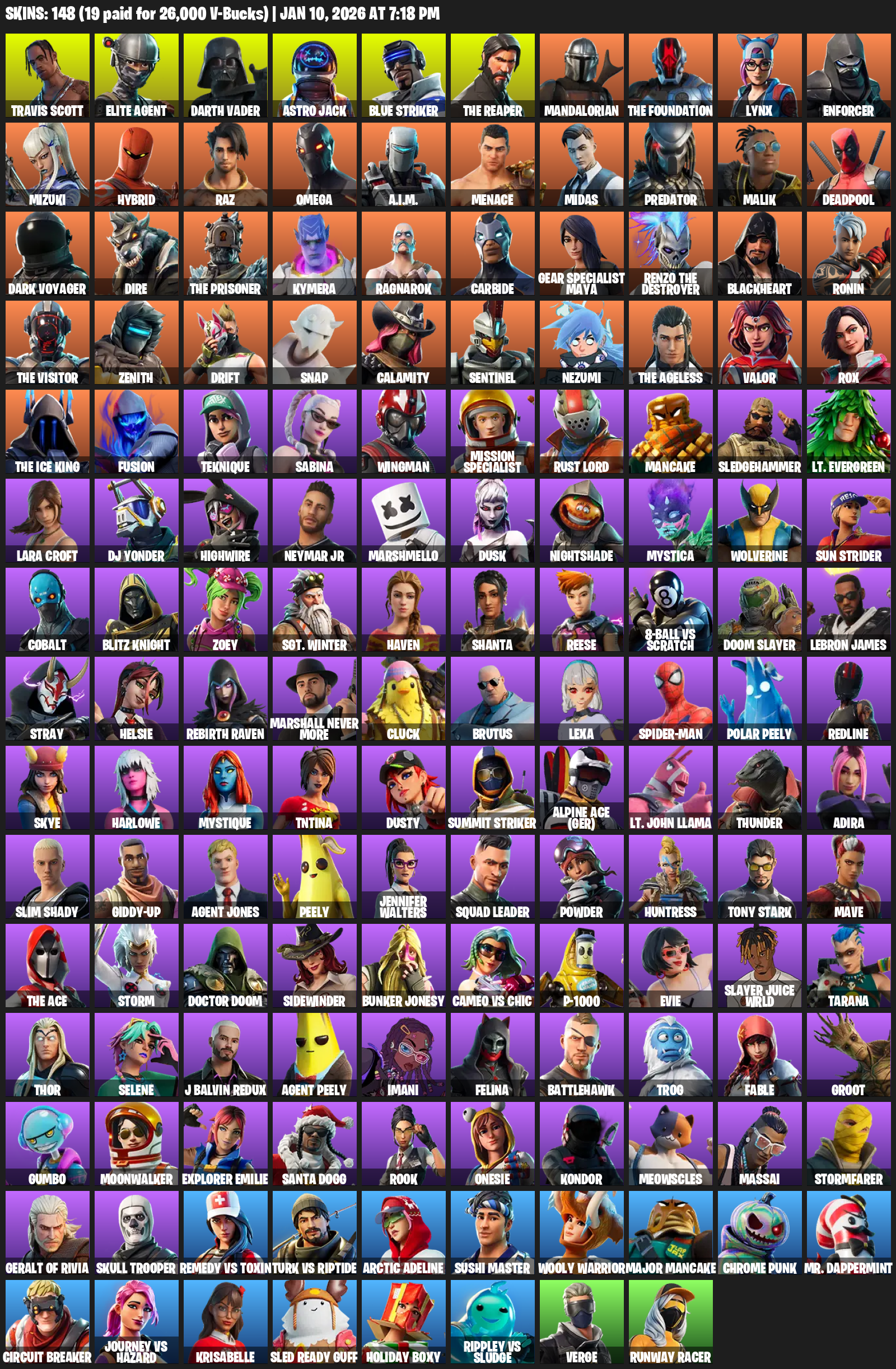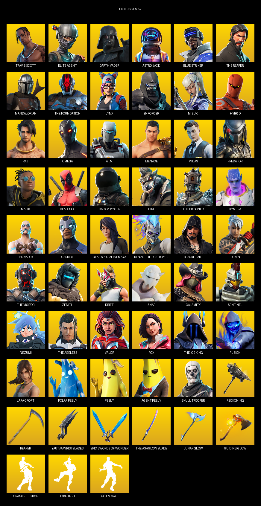 Travis Scott, Elite Agent, The Reaper, Omega, Gear Specialist Maya, Lara Croft, Darth Vader, Astro Jack, Blue Striker, Mandalorian, Lynx, Enforcer, Mizuki, Hybrid, Raz, A.I.M., Menace, Midas, Predator