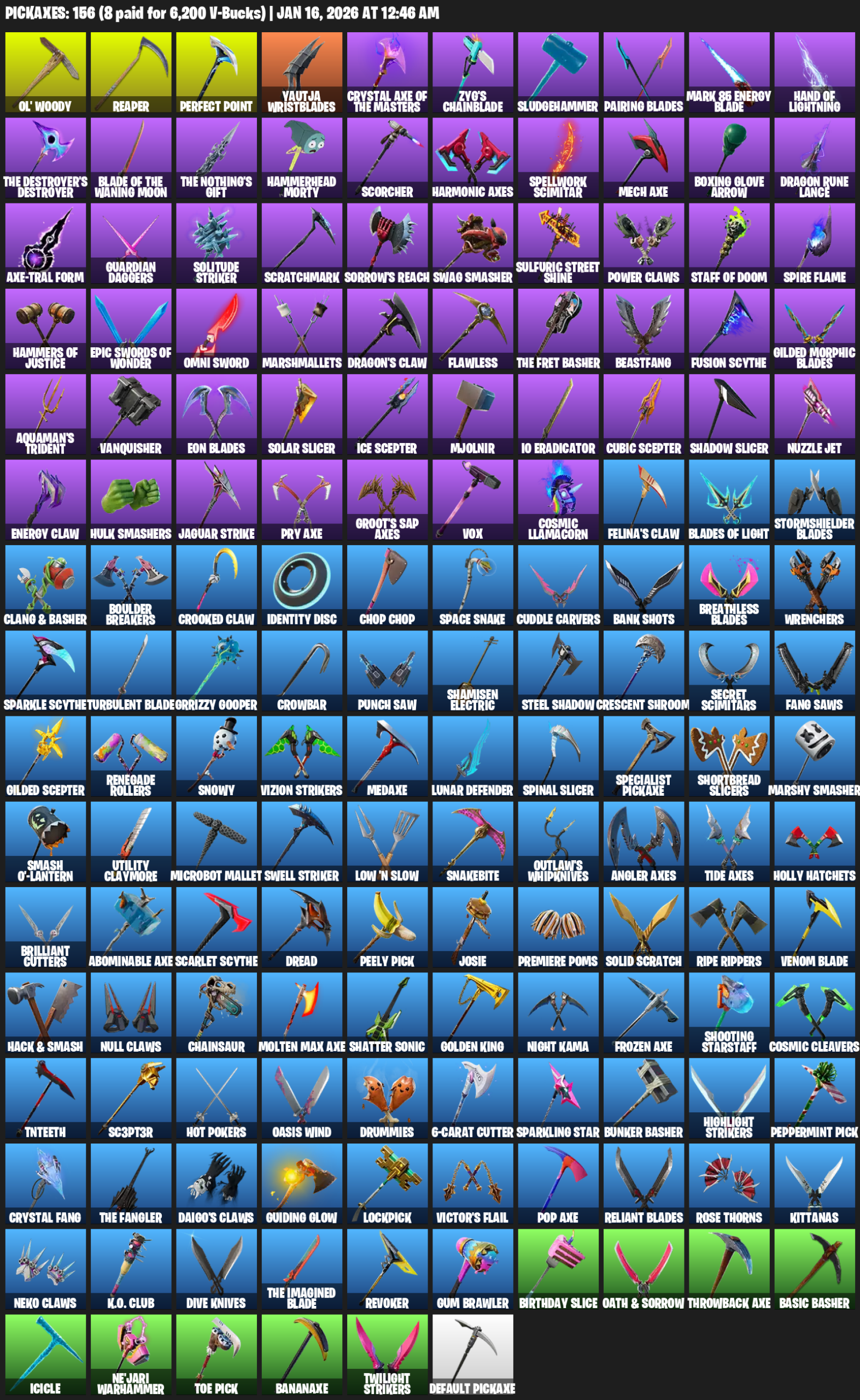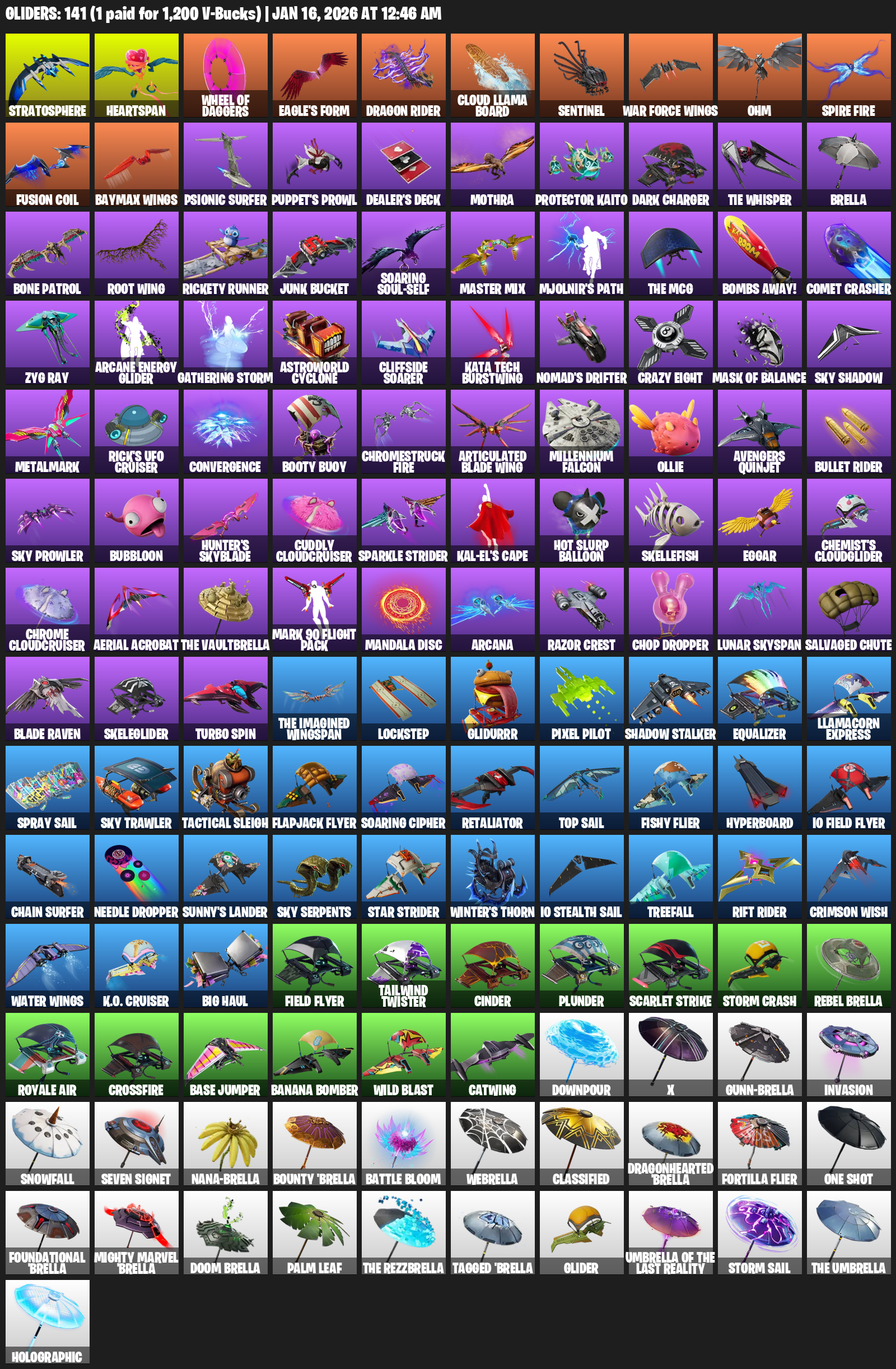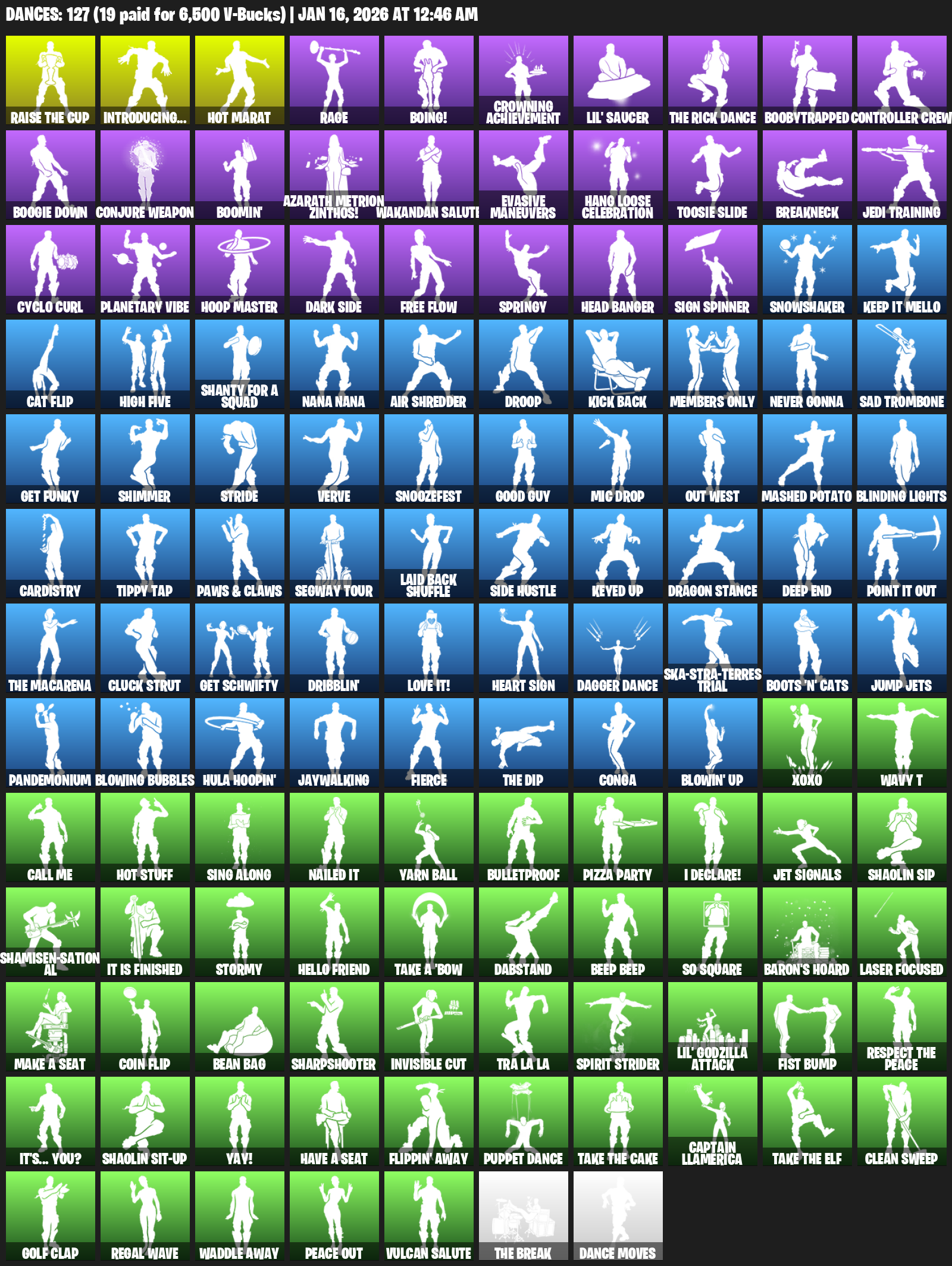 Introducing…, Hot Marat, Rage, Boing!, Crowning Achievement, Lil’ Saucer, Boobytrapped, Controller Crew, Boogie Down, Conjure Weapon, Boomin’, Azarath Metrion Zinthos!, Wakandan Salute, Evasive Maneuvers, Hang Loose Celebration, Toosie Slide, Breakneck, Jedi Training