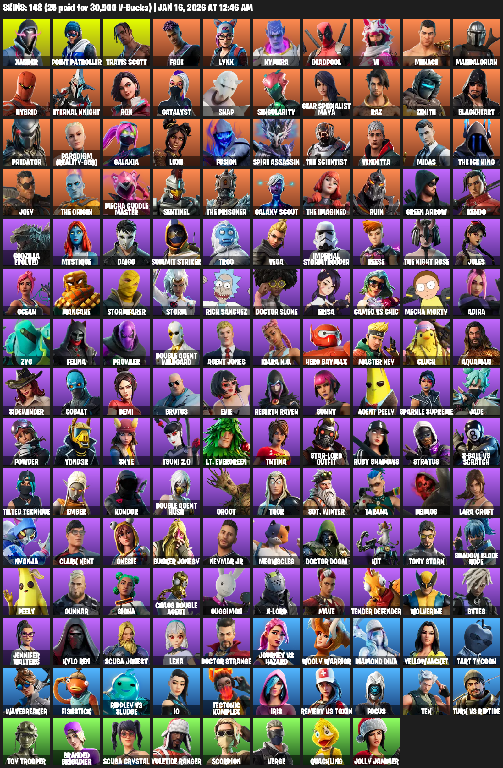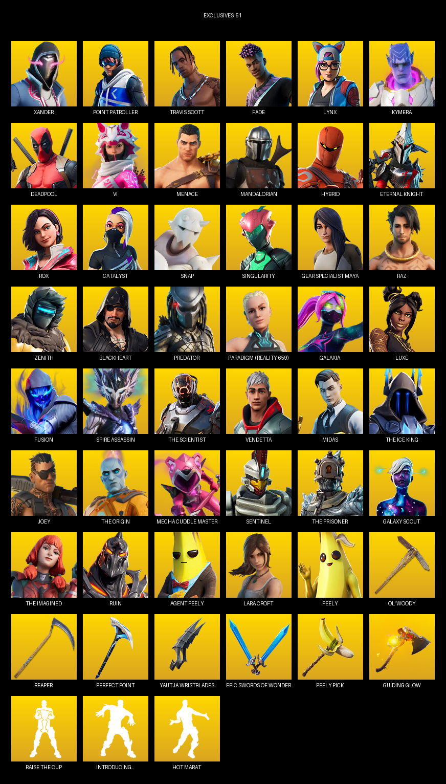 Point Patroller, Travis Scott, Gear Specialist Maya, Lara Croft, Xander, Fade, Lynx, Kymera, Deadpool, Vi, Menace, Mandalorian, Hybrid, Eternal Knight, Rox, Catalyst, Snap, Singularity, Raz, Zenith