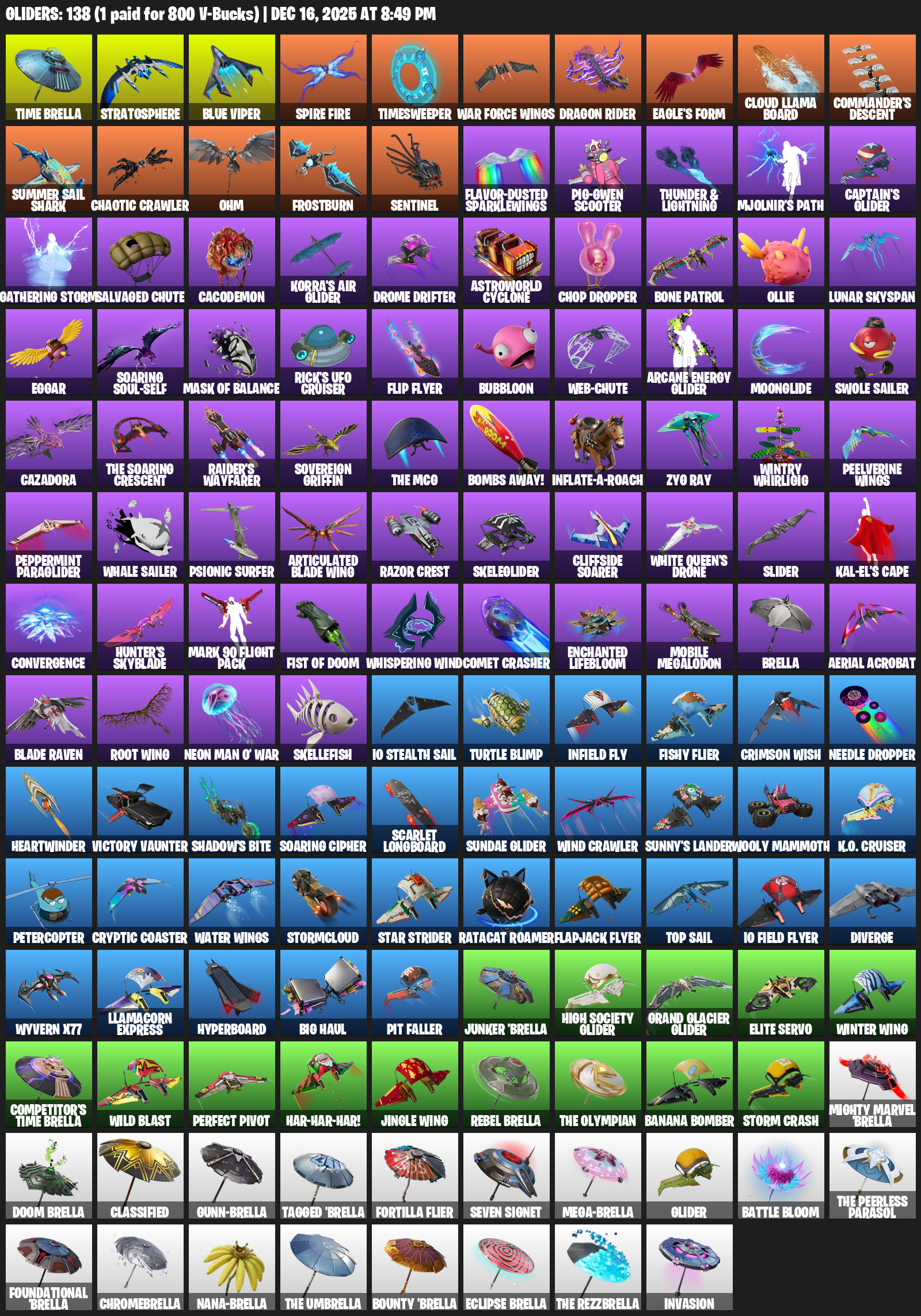 Time Brella, Stratosphere, Blue Viper, Timesweeper, War Force Wings, Dragon Rider, Eagle’s Form, Commander’s Descent, Summer Sail Shark, Chaotic Crawler, Ohm, Frostburn, Sentinel, Flavor-Dusted Sparklewings, Pig-Gwen Scooter, Thunder & Lightning, Mjolnir’s Path, Captain’s Glider