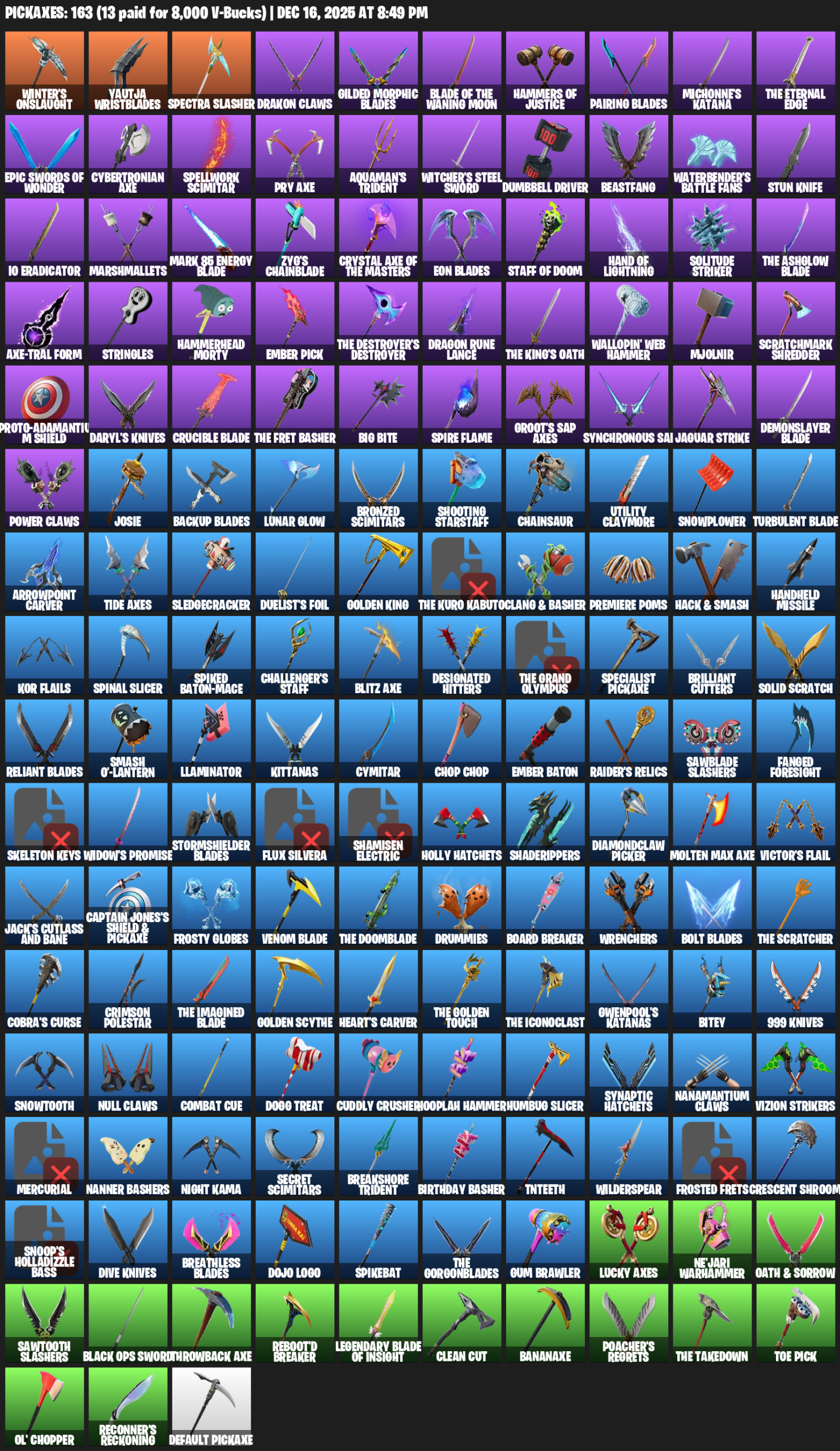 Winter’s Onslaught, Yautja Wristblades, Drakon Claws, Gilded Morphic Blades, Hammers of Justice, Michonne’s Katana, Cybertronian Axe, Spellwork Scimitar, Aquaman’s Trident, Witcher’s Steel Sword, Dumbbell Driver, Beastfang, Waterbender’s Battle Fans, Stun Knife