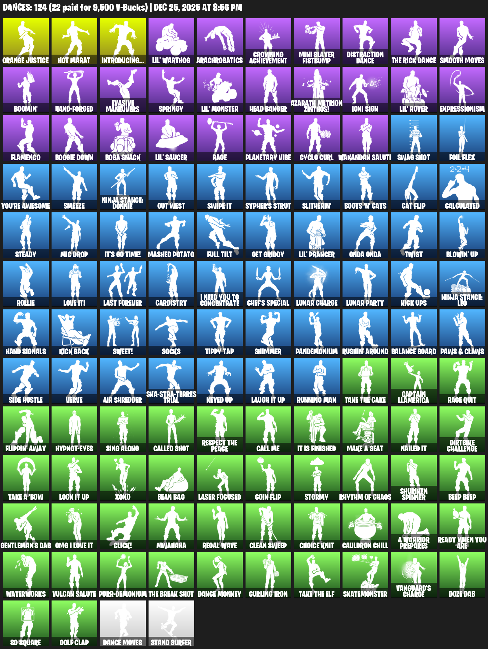 Hot Marat, Introducing…, Orange Justice, Lil’ Warthog, Arachrobatics, Crowning Achievement, Mini Slayer Fistbump, Distraction Dance, Smooth Moves, Boomin’, Evasive Maneuvers, Springy, Head Banger, Azarath Metrion Zinthos!, Igni Sign, Expressionism