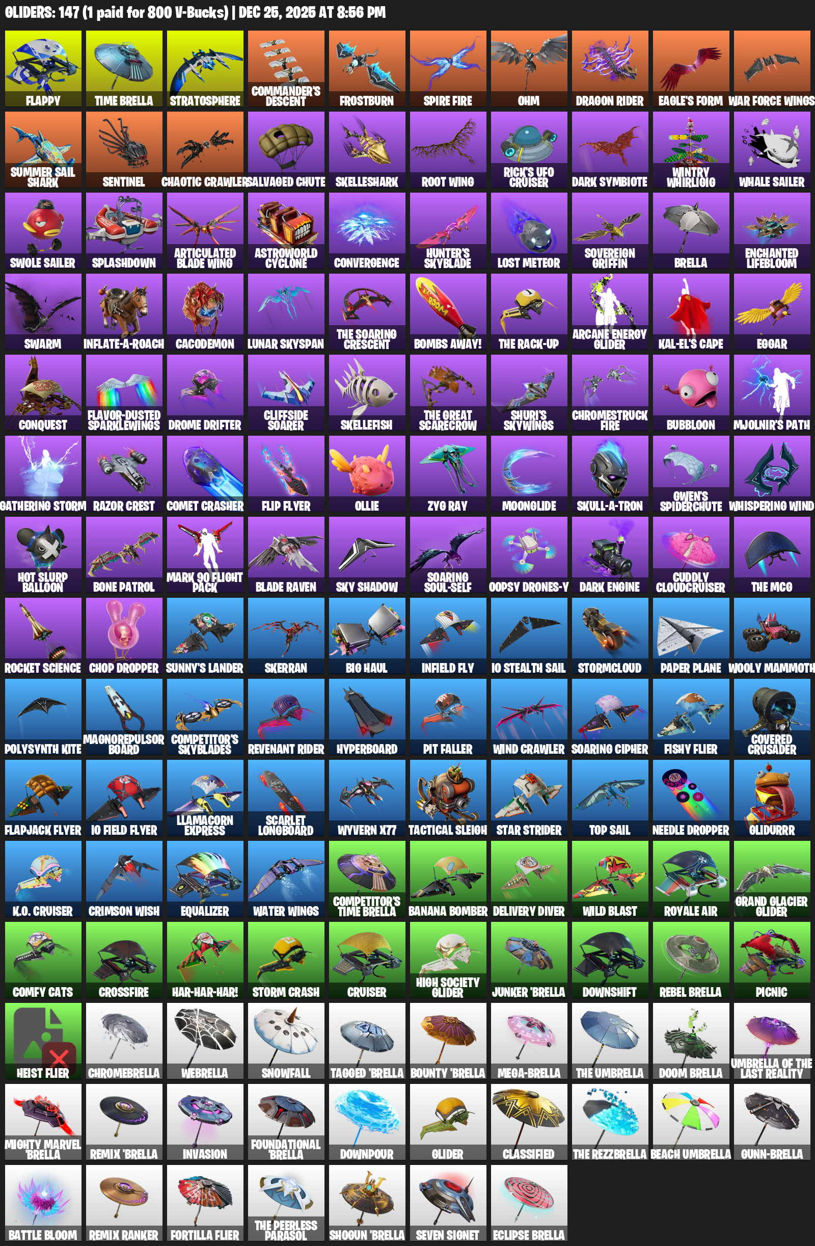 Flappy, Time Brella, Stratosphere, Commander’s Descent, Frostburn, Ohm, Dragon Rider, Eagle’s Form, War Force Wings, Summer Sail Shark, Sentinel, Chaotic Crawler, Salvaged Chute, Skelleshark, Root Wing, Rick’s UFO Cruiser, Dark Symbiote, Wintry Whirligig, Whale Sailer
