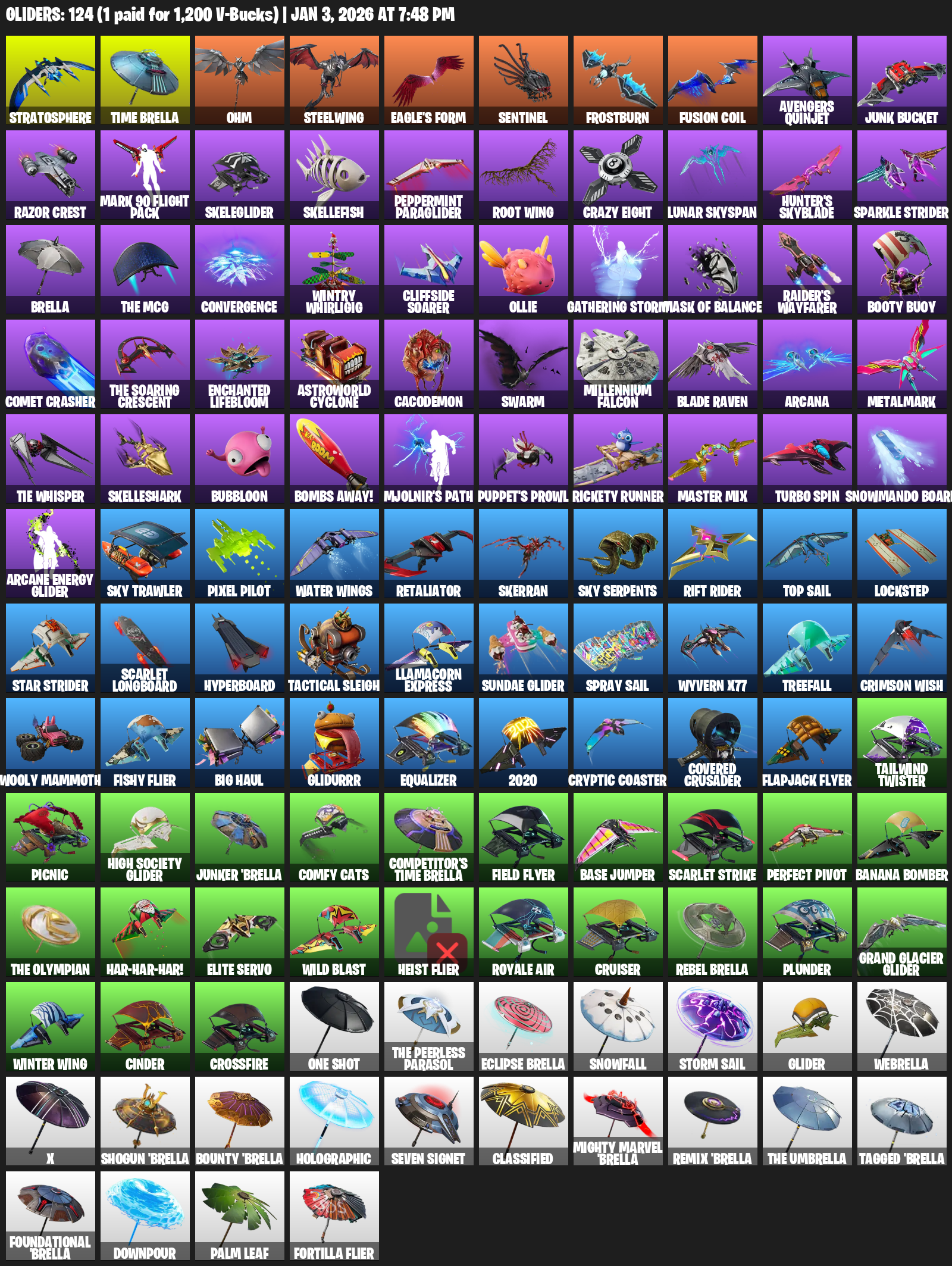 Stratosphere, Time Brella, Ohm, Steelwing, Eagle’s Form, Sentinel, Frostburn, Avengers Quinjet, Junk Bucket, Razor Crest, Skeleglider, Skellefish, Peppermint Paraglider, Root Wing, Crazy Eight, Lunar Skyspan, Hunter’s Skyblade, Sparkle Strider