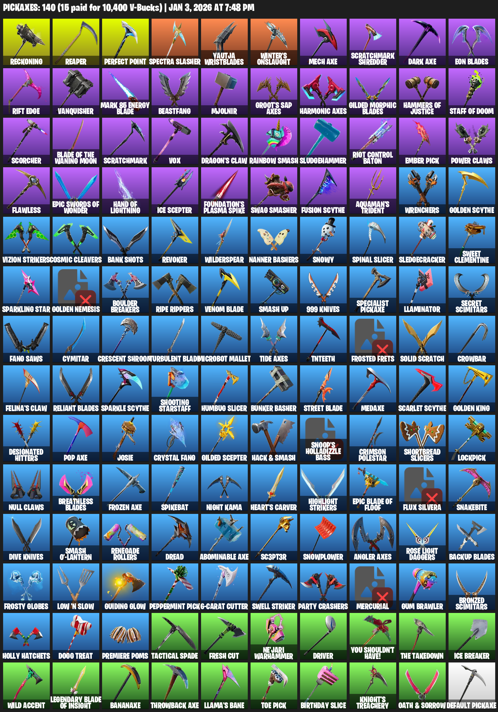 Reckoning, Reaper, Yautja Wristblades, Winter’s Onslaught, Mech Axe, Scratchmark Shredder, Eon Blades, Rift Edge, Vanquisher, Mark 85 Energy Blade, Beastfang, Mjolnir, Groot’s Sap Axes, Hammers of Justice