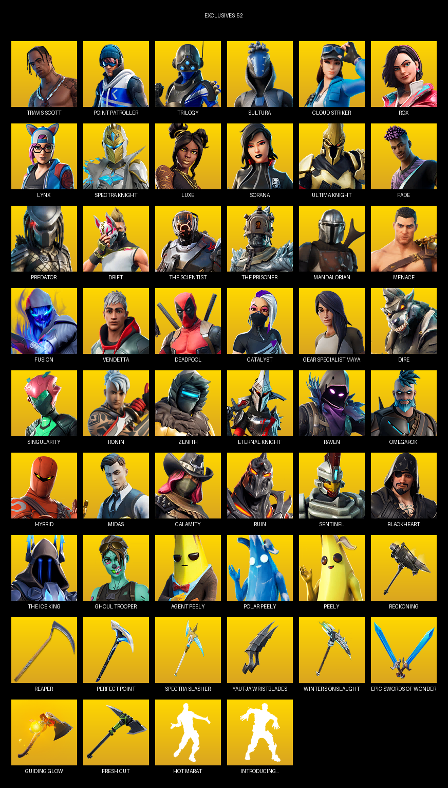 Travis Scott, Point Patroller, Gear Specialist Maya, Trilogy, Sultura, Cloud Striker, Rox, Lynx, Spectra Knight, Luxe, Sorana, Fade, Predator, Drift, The Scientist, Mandalorian, Menace, Fusion