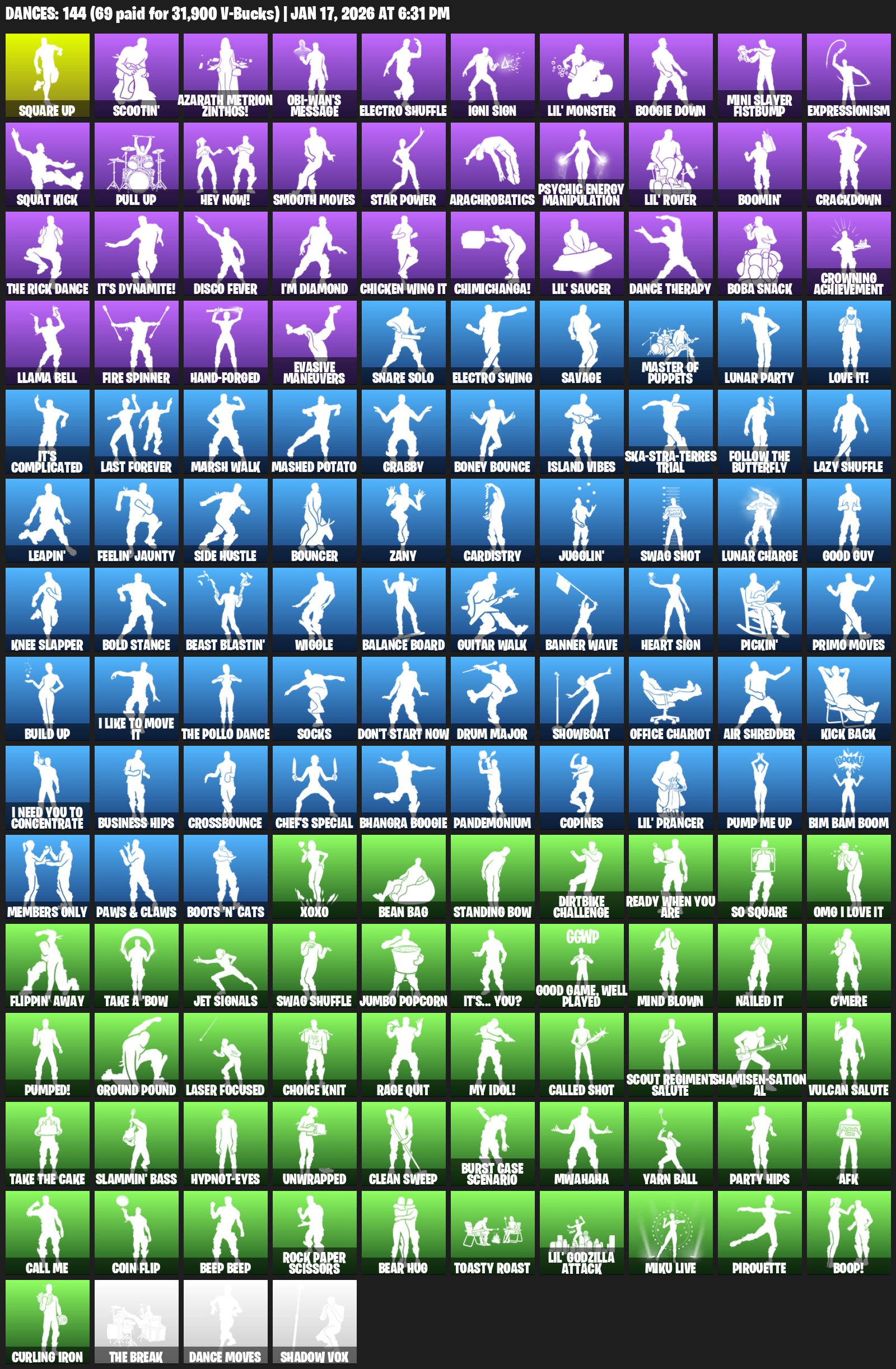 Square Up, Scootin’, Azarath Metrion Zinthos!, Obi-Wan’s Message, Electro Shuffle, Igni Sign, Lil’ Monster, Boogie Down, Mini Slayer Fistbump, Expressionism, Squat Kick, Hey Now!, Smooth Moves, Star Power, Arachrobatics, Psychic Energy Manipulation, Boomin’, Crackdown